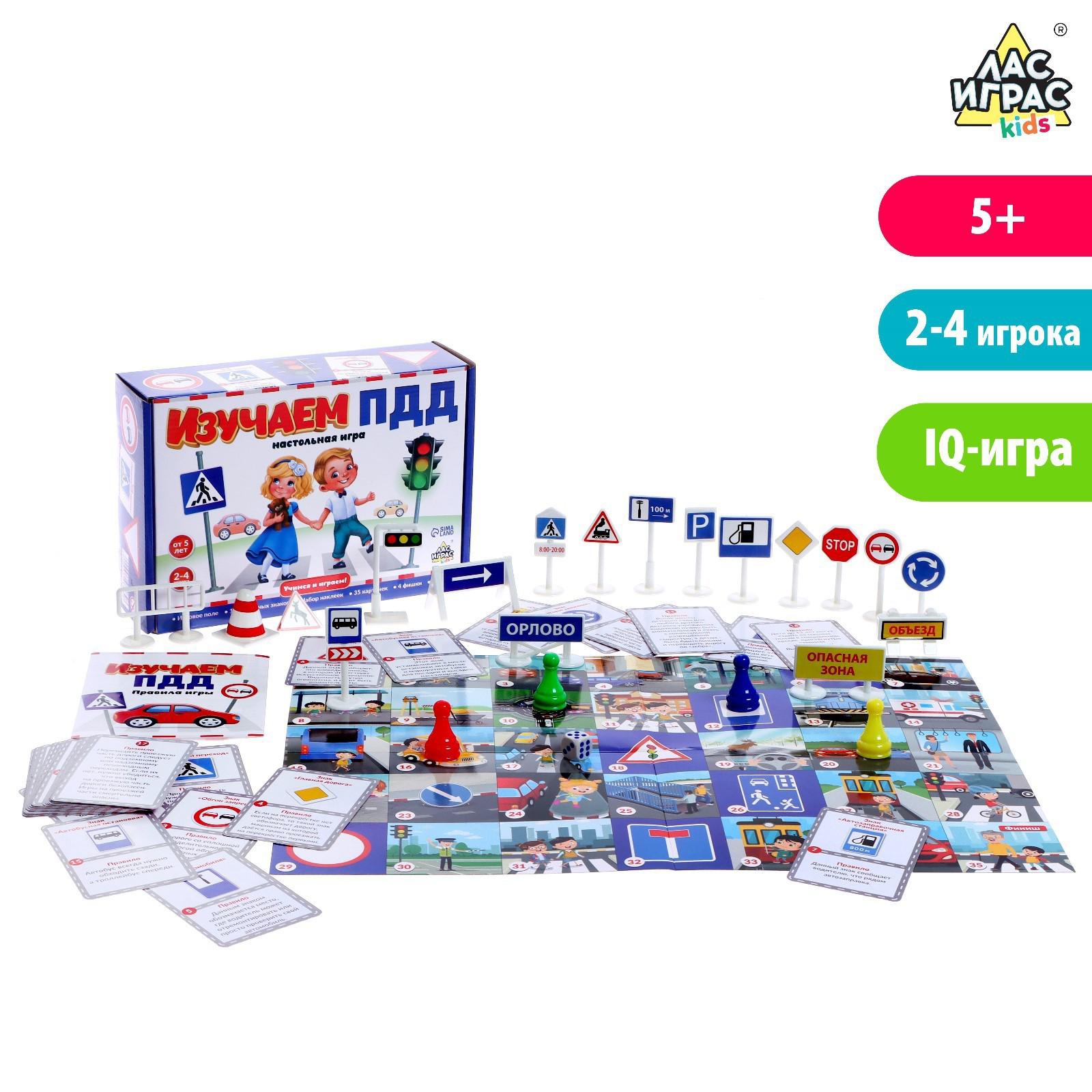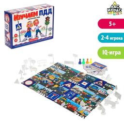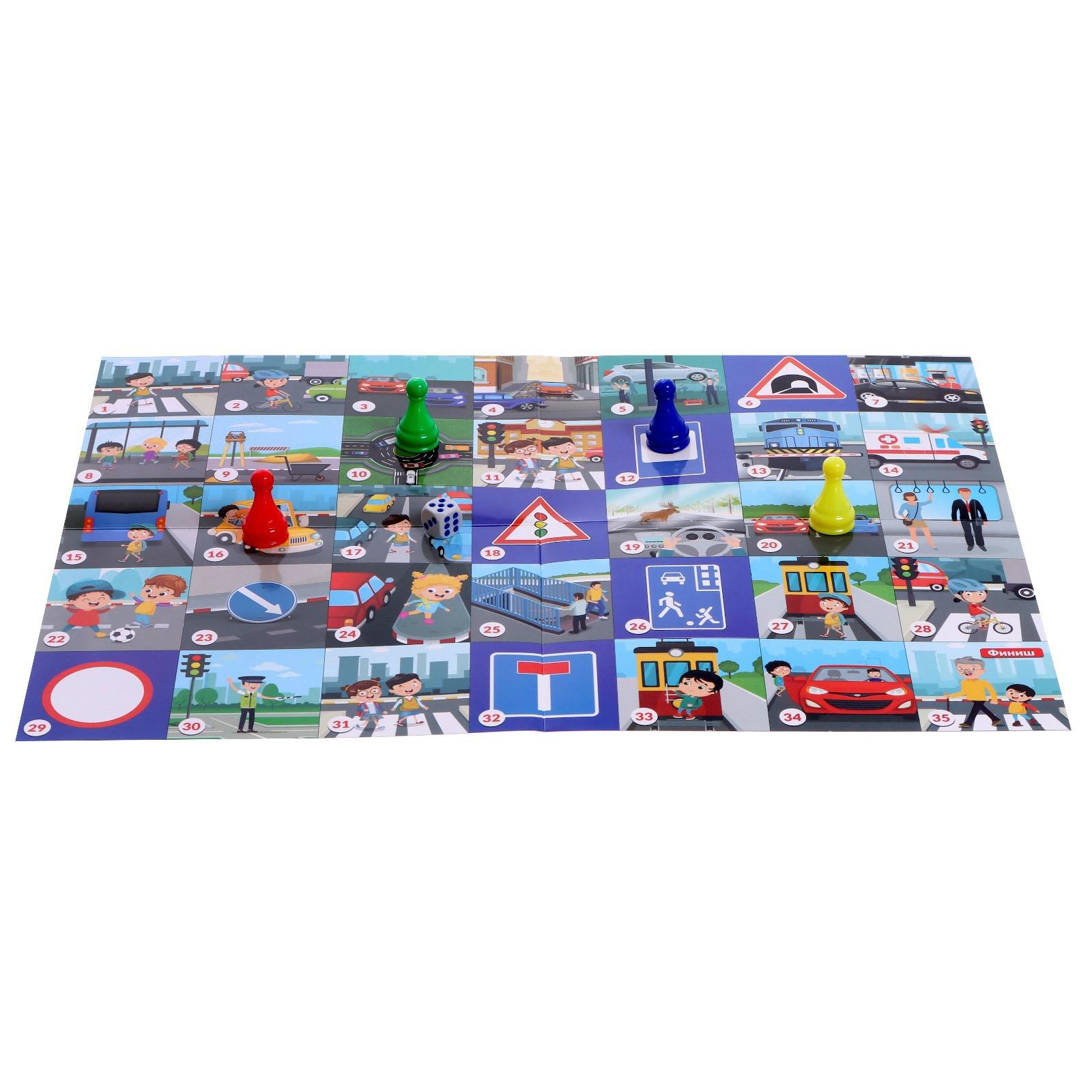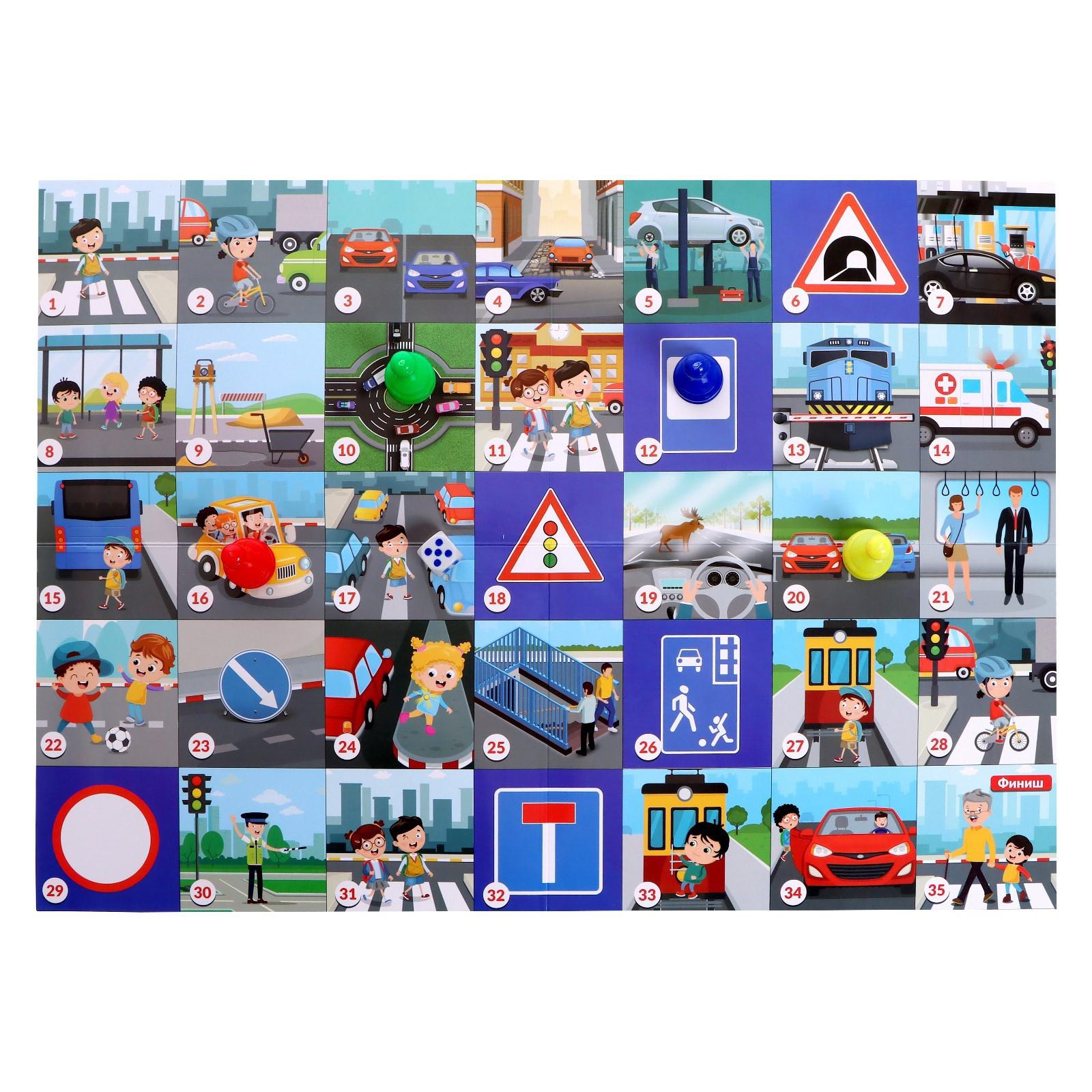 Внутри набора вас ждёт большое игровое поле с различными дорожными ситуациями, карточки с правилами, которые необходимо знать и следовать. Освежить в памяти ПДД будет интересно даже взрослому!