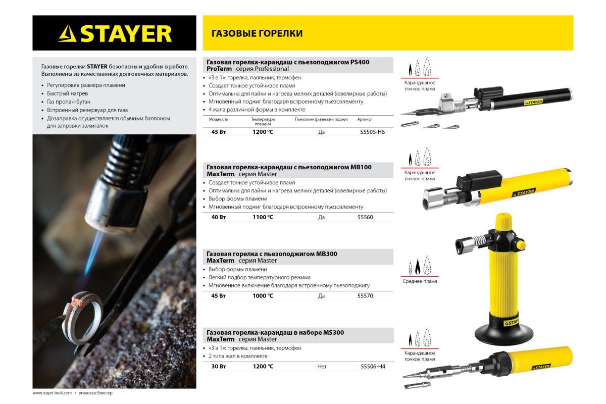 Газовая горелка STAYER ''PROFESSIONAL'' 55505-H6 2в1 пьезоподжиг рег.пламени 4насадки 1200С