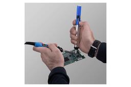 МЕГЕОН 00190 - новинка в модельном ряду наборов для пайки. Подборка собрала в себе всё необходимое для осуществления паяльных работ и лужения. В качестве паяльника применён МЕГЕОН 00180, который себя уже зарекомендовал себя, как надёжный прибор высокого качества изготовления. Выгодными отличиями представляются цифровое управление и индикация температуры, а также мощность нагревательного элемента. Для проведения качественной и специфической распайки были использованы распространённые размеры наконечников в количестве 6 штук (одно установлено). В дополнение типоразмер 900М-Т позволяет дополнить комплект ещё 24 различными жалами. Удаление бессвинцовых припоев проводится оловоотсосом, а для удержания микроэлементов предусмотрен пинцет. Также преимуществом является наличие кроссеровочного ножа. Хранение и транспортировка осуществляется в удобном жёстком пенале с удерживающими стропами.