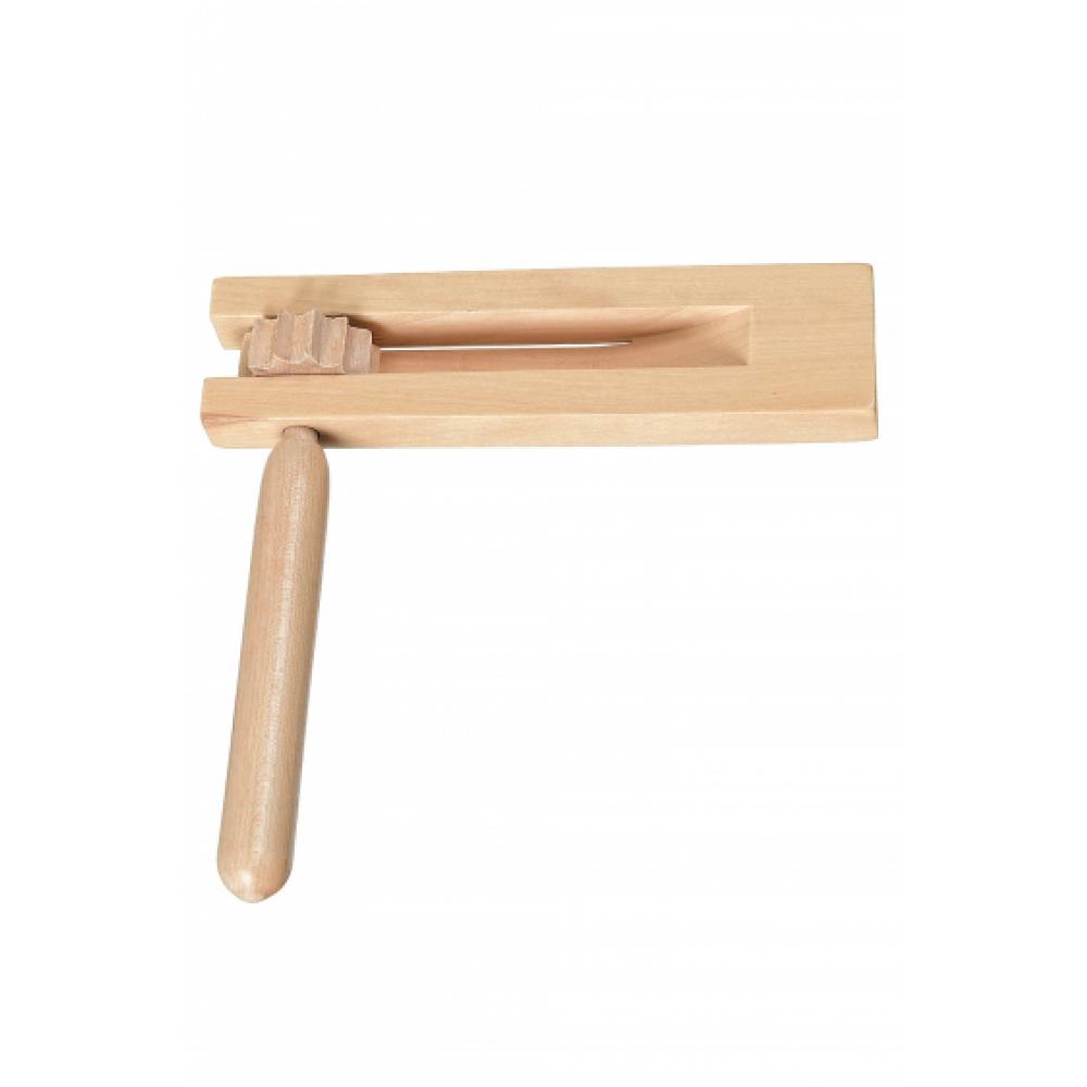 Трещотка один из древнейших музыкальных шумовых инструментов, распространенный у многих народов мира. На трещотке играют двумя способами. Первый из них заключается в том, чтобы держать корпус трещотки неподвижно и крутить ручку. В этом случае получается спокойное стрекотание. При игре вторым способом корпус трещотки сильным взмахом заставляют вращаться, извлекая резкий и пронзительный звук. На Руси трещотки использовались при исполнении песен и плясок, а также в свадебных обрядах, чтобы отогнать злых духов от молодых. Данная модель сделана из дерева и представляет собой прямоугольную пластину с выемками, в которые помещена шестеренка, прикрепленная к удобной ручке. Трещотка проста и легка в обращении, подойдет для игр с детьми.