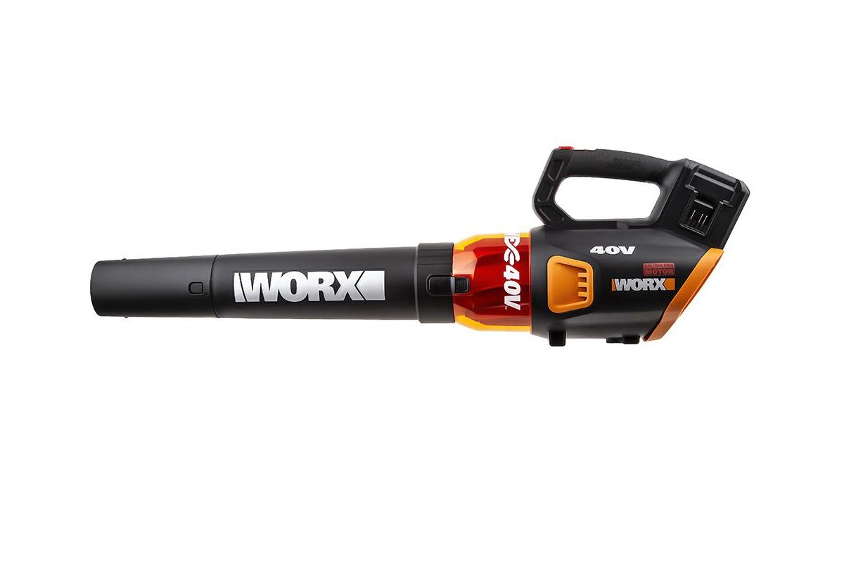 Аккумуляторная воздуходувказ с бесщеточным WORX WG584E, работающая от двух аккумуляторов 20В.