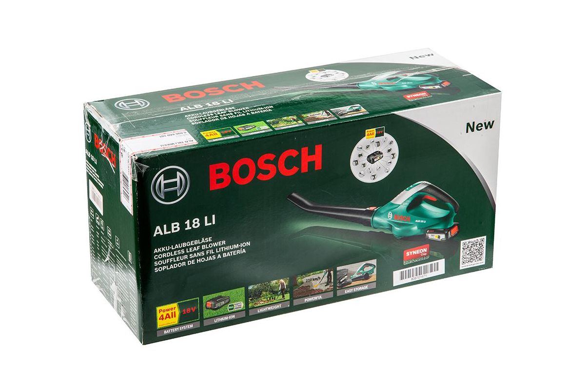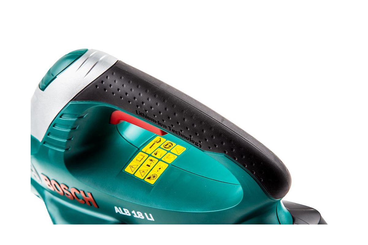 BOSCH ALB 18 LI – аккумуляторная воздуходувка для сбора листьев, маленьких веток, опилок и прочего лёгкого сора. Работает от 18 В аккумулятора. Аккумулятор и зарядное устройство входят в комплект, не придётся докупать их отдельно. Без аккумулятора весит 1,8 кг