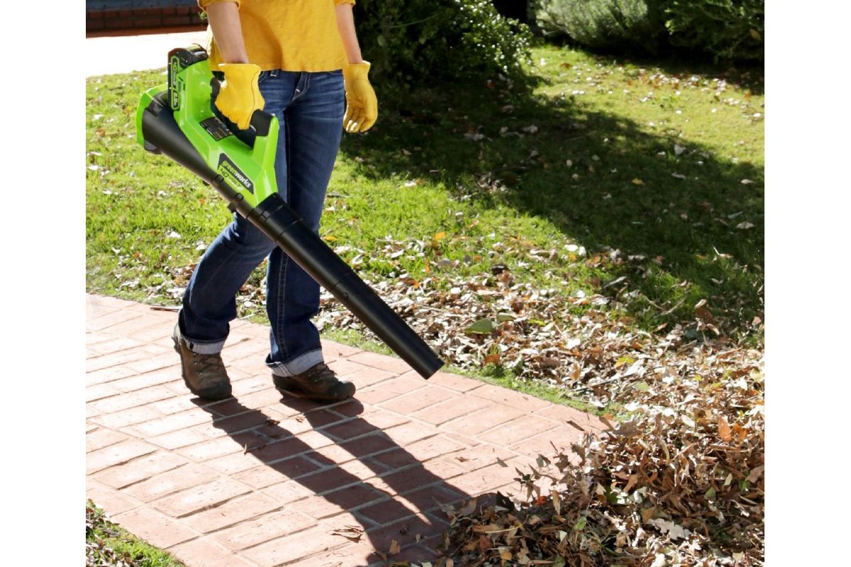 GREENWORKS G40AB – воздуходувка для уборки опавшей листвы, скошенной травы и другого лёгкого мусора на загородных участках. Работает от универсального аккумулятора G-MAX 40. Аппарат свободен от проводов, подходит для уборки удалённых от розетки участков.