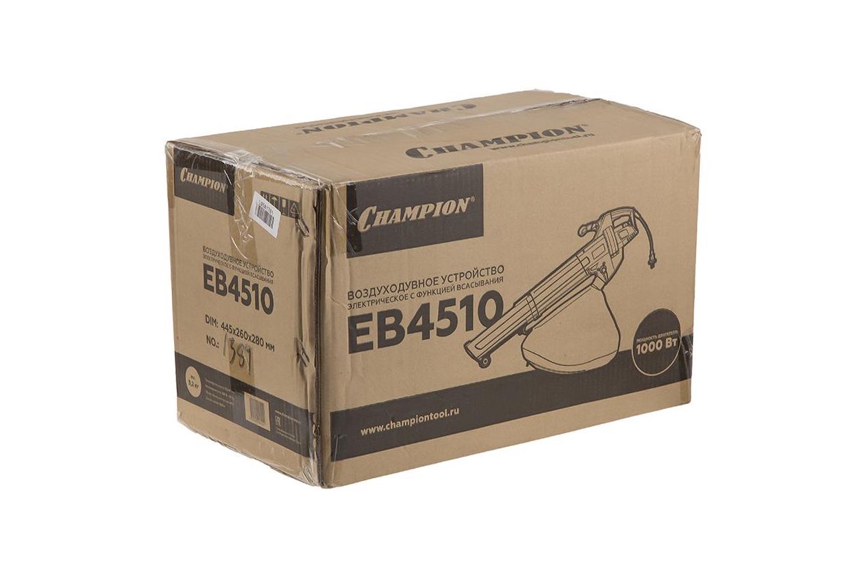 CHAMPION EB4510 – воздуходувка-пылесос для уборки мусора и листвы на садовом участке. Мощность – 1000 Вт, максимальная производительность – 810 м3/ч. Работает от электросети.