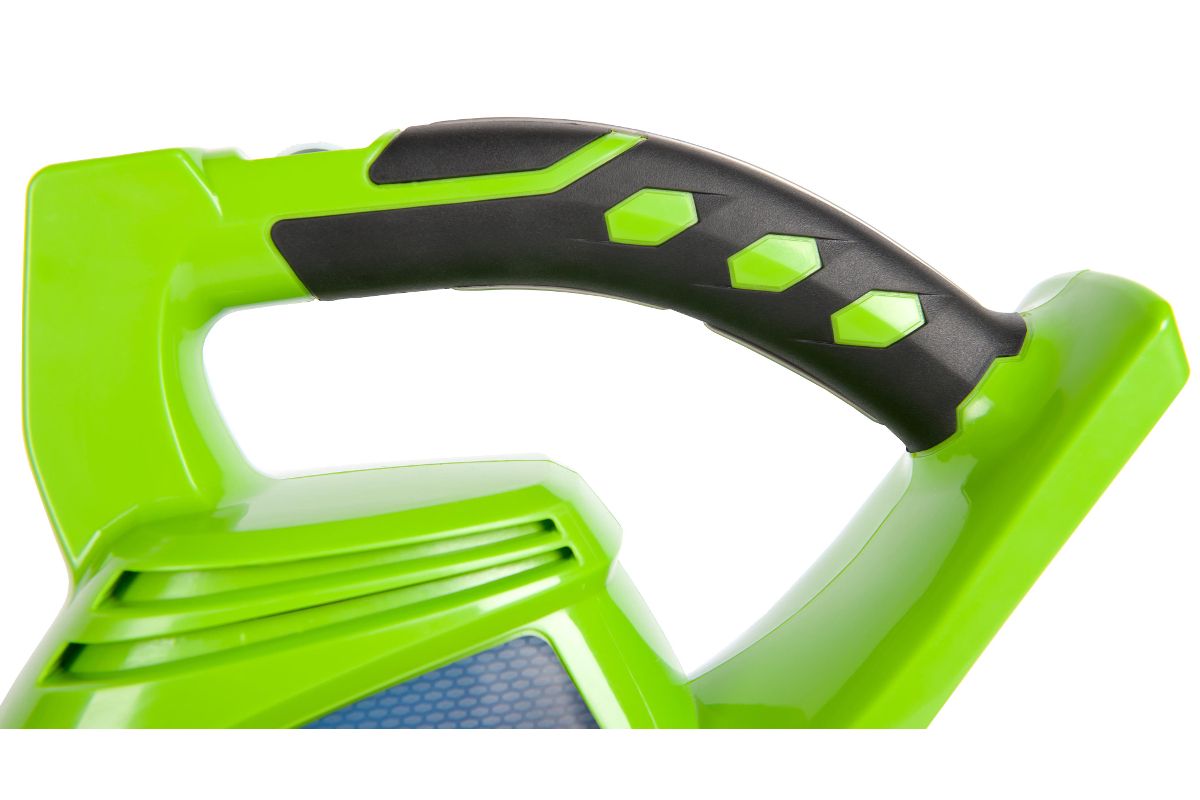 Воздуходув имеет 6 скоростей, а максимальная скорость воздушного потока = 280 км/ч. Конструкцией предусмотрены стальные ножи для мульчирования листьев. Рукоятка имеет эргономичный дизайн с прорезиненной поверхностью. Немаловажным достоинством является компактные размеры и малый вес устройства по сравнению с бензиновой техникой, всего 4,84 кг. Предусмотрена система защиты от случайного попадания предметов в лопасти турбины. Воздуходув работает от аккумуляторной батареи G-MAX 40V, которую можно использовать с другими устройствами линейки 40V (15+ устройств).