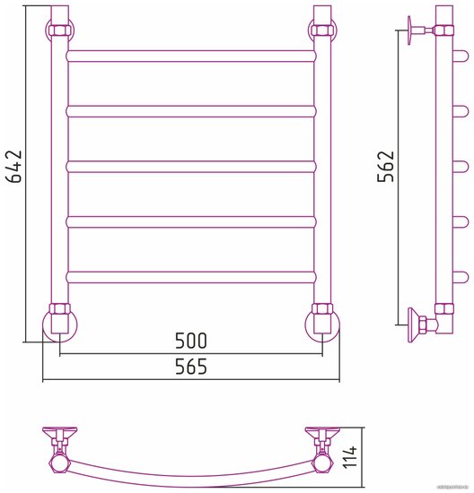 - Комплектация Полный комплект для водяного подключения полотенцесушителя через угловые элементы с узлами для сброса воздуха.