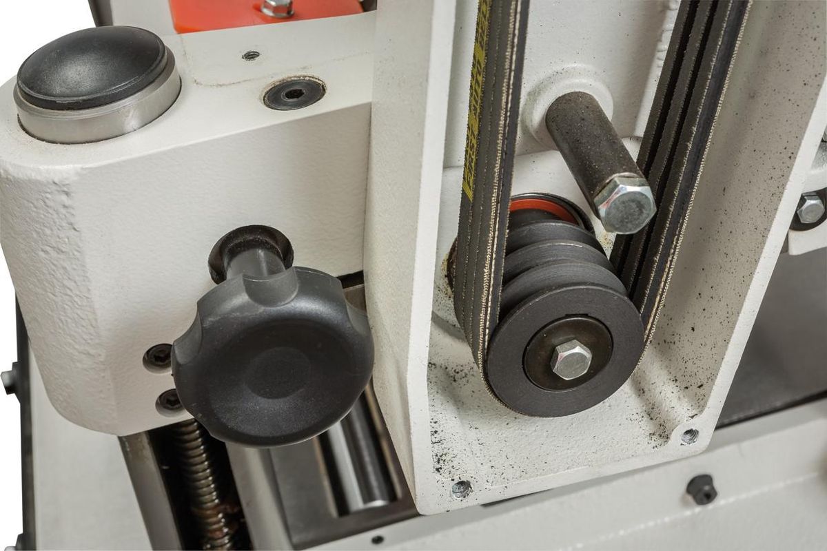 Механизм подачи с двумя скоростями, валы металлические (первый с насечками, второй гладкий), основной чугунный стол и съёмные удлинители имеют ролики для снижения трения заготовки.