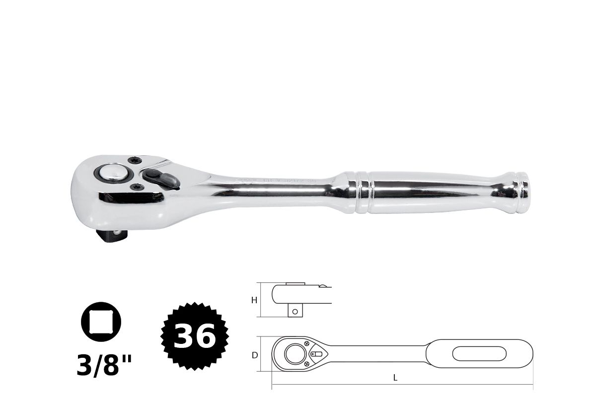Трещотка AIST 32172-36 3/8'', 36 зуб., усиленная 2-зубца, полир. метал. ручка, 200мм Трещотка 3/8'', 36 зуб., усиленная 2-зубца, полир. метал. ручка, 200мм.