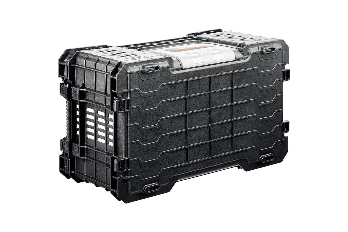 Прочная система транспортировки GEAR с вместительными модулями предлагает разные варианты компоновки элементов. Металлические ручки не только позволяют переносить ящики, но и надежно фиксируют их друг с другом.