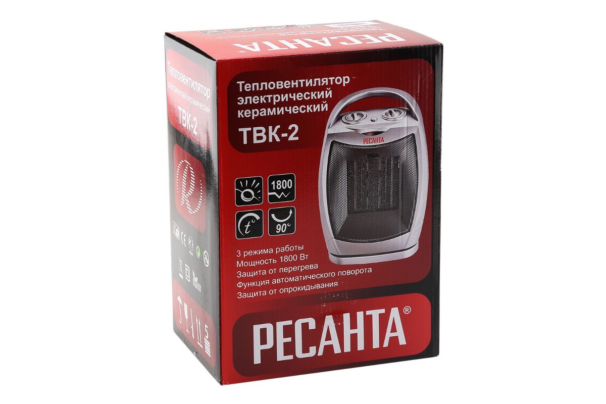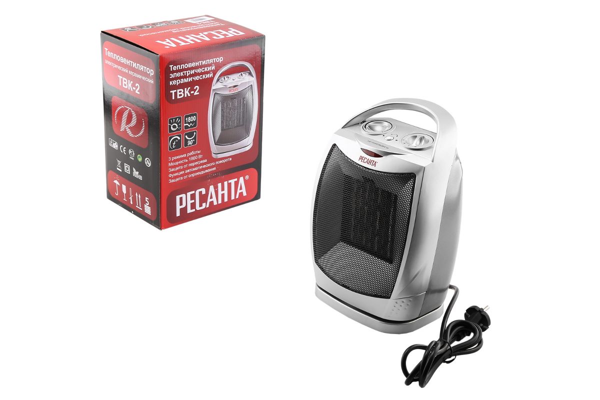 РЕСАНТА ТВК-2 – компактный тепловентилятор для дома, дачи или офиса. Благодаря мощности 1800 Вт прогревает помещение площадью 16-18 кв.м. Устанавливается на пол, на расстоянии не меньше 50 см от мебели, стен, занавесей и т.д. Керамический нагреватель не пересушивает воздух.