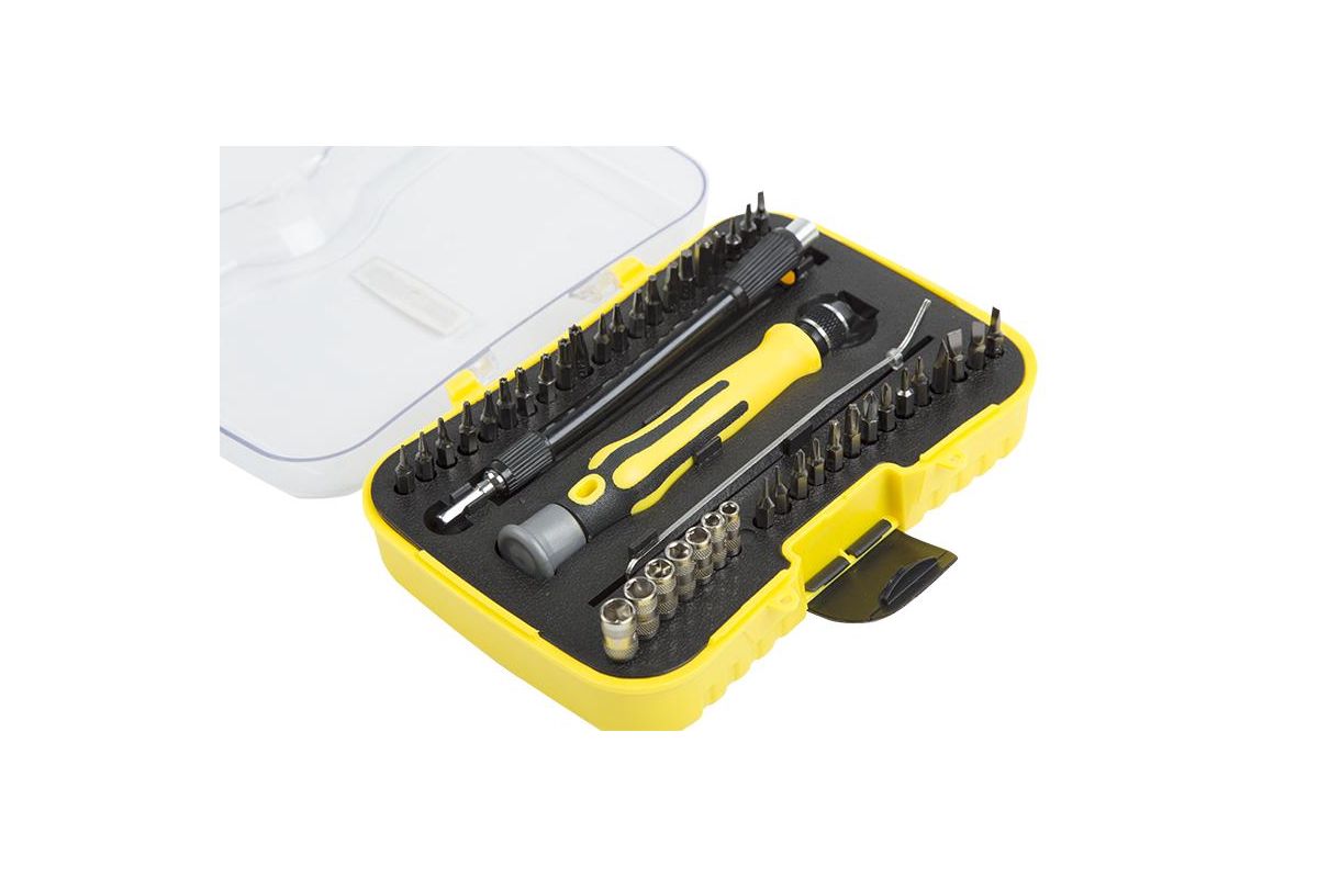 - Биты 42 шт: Т3, Т4, Т5, Т6, Т7, Т8, Т9, Т10, Т15, Т20, H 0.9, H 1.3, H 1.5, H 2.0, H 2.5, H 3.0, H 4.0, Pentalobe 0,8, SL1.0, SL1.5, SL 2.0, SL 2.5, SL3.0, SL3.5, SL4.0, PHOOO, PHOO, PH0, PH1, PH2, треугольный шлиц 3.0, U2.6, круглой шлиц 1.5, ? 0, ? 1, ? 0,8, М2.5, М3, М3.5, М4, М5, М5.5;