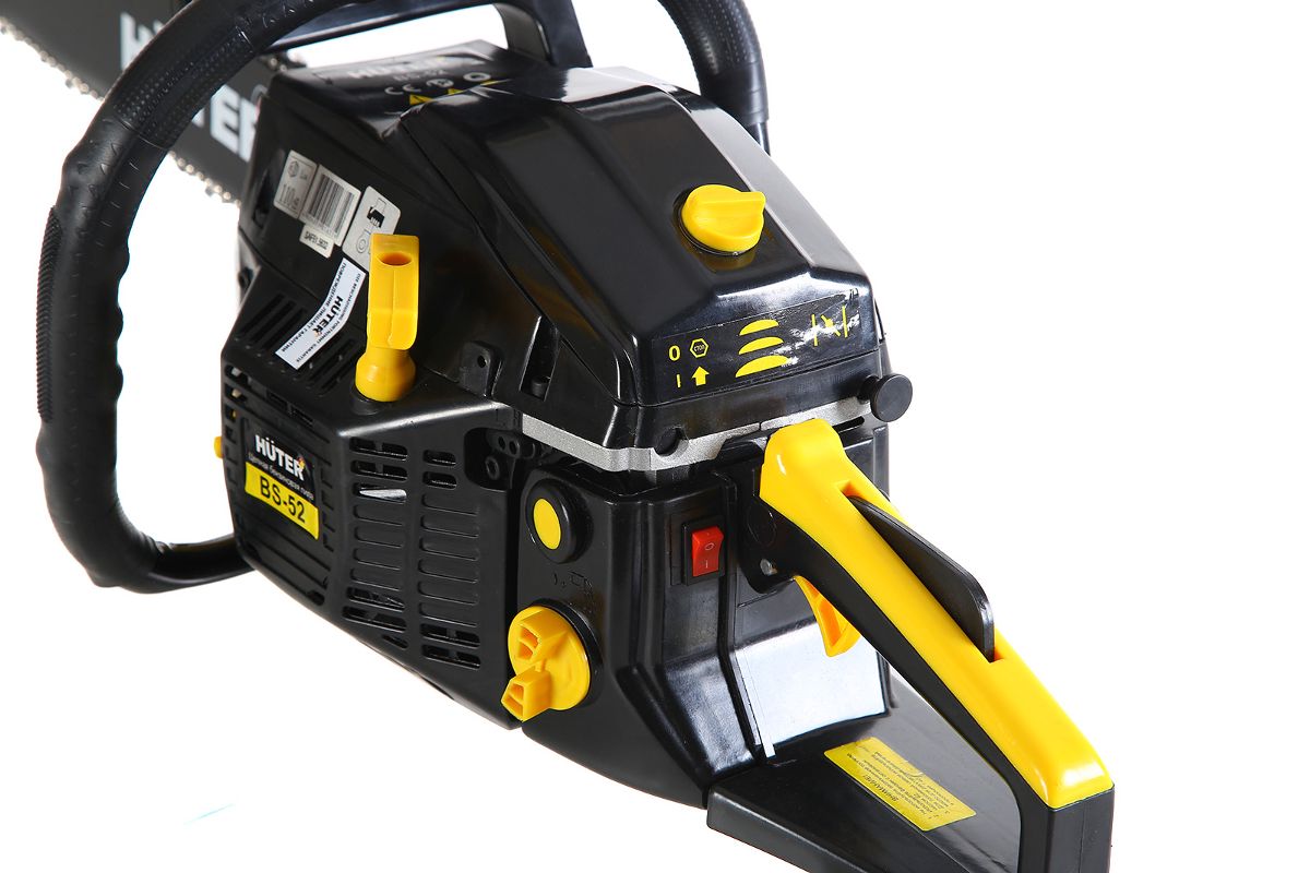 HUTER BS-52 — бытовая бензопила с длинной 20-дюймовой шиной. Отличается производительностью и удобным управлением. За счет мощного двигателя (3,4 л.с.) быстро выполняет сложные распилы, например в плотных материалах. Как и другие модели в линейке, эта пила оборудована эргономичными рукоятками и тормозом цепи. Вес модели (с полным снаряжением) — 7,5 кг.