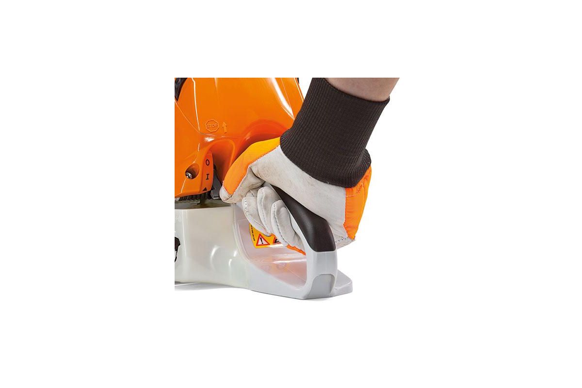 Переключение режима запуска и выключение осуществляется одним рычагом. Расположен он прямо под пальцем - ладони остаются на рукоятках пилы.