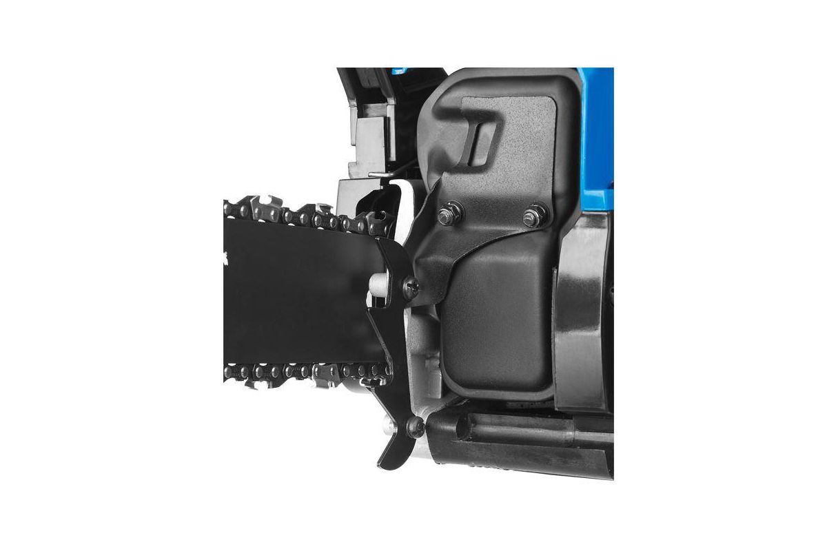 Двойной тормоз цепи (откидывание защитного щитка или отпускание клавиши блокировки на рукоятке), встроенный цепеуловитель и упор из металла делают пилу безопасной в использовании.