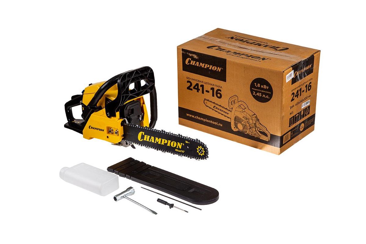 Бытовая бензопила CHAMPION 241 оборудована двигателем мощностью 2,4 л.с. Подойдёт для нечастого использования на даче – обрезания веток, распилки стройматериалов, заготовки дров.