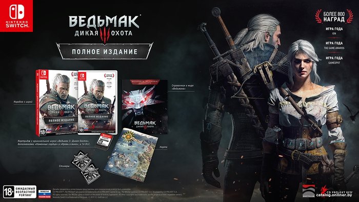 В комплекте- картридж с наиболее полной версией игры «Ведьмак 3: Дикая Охота», дополнениями «Кровь и вино», «Каменные Сердца» и 16-ю другими дополнениями;- книга «Вселенная Ведьмака. Компендиум»;- подробная карта игрового мира;- эксклюзивный набор наклеек.