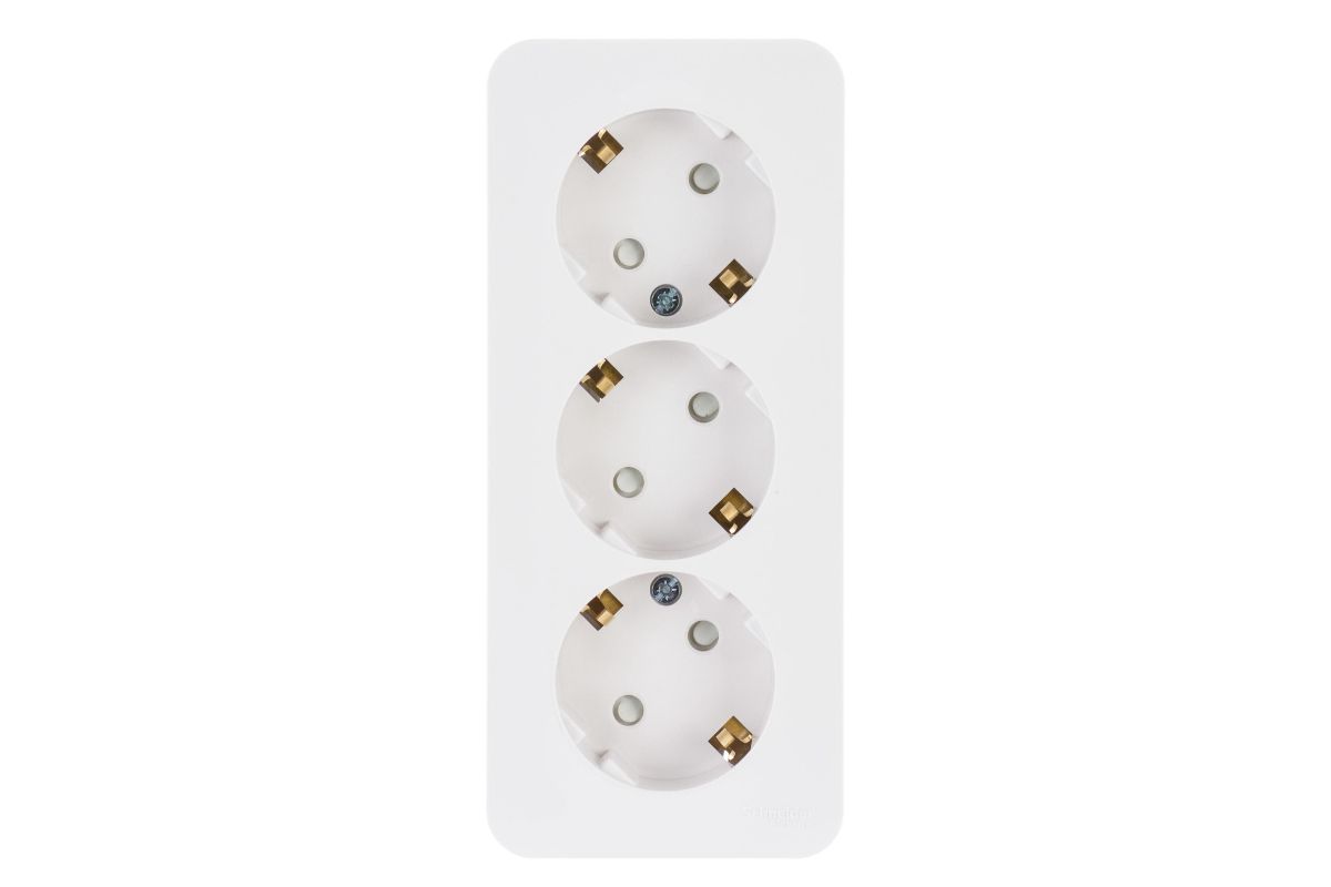 Розетка Schneider Electric BLANCA (белый, открытой установки) трехместная, с заземлением, шторками и изолирующей пластиной предназначена для сетей до 250В, на ток до 16А. Трехместная розетка позволяет подключить три устройства в одном месте. Шторки и заземление обеспечивают дополнительную безопасность при косвенном прикосновении.