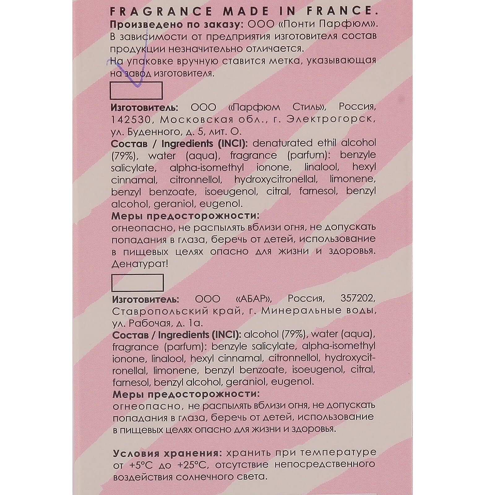 Состав: денатурированный спирт 80%, парфюмерная композиция 10%, вода 10%.