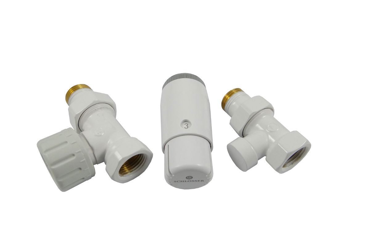 Прямой белый термостатический комплект Schlosser (Шлессер) включает термостатическую головку, термостатический клапан и клапан обратного потока. Подходит для радиаторов отопления с боковым подключением.