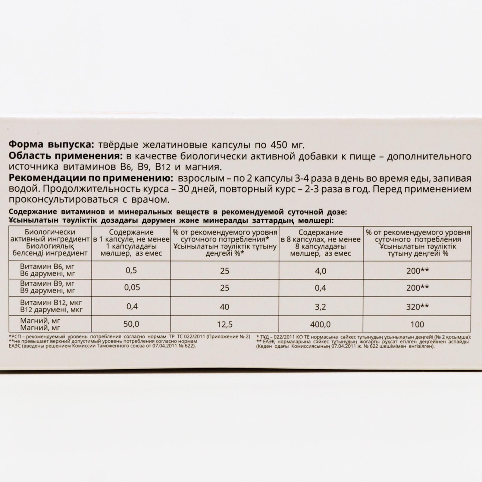 Состав: тримагния дицитрат безводный, пиридоксина гидрохлорид (витамин B6), фолиевая кислота (витамин B9), цианокобаламин (витамин B12). Вспомогательные компоненты: микрокристаллическая целлюлоза, кальция стеарат, капсула (желатин, красители: диоксид титана, жёлтый хинолиновый, кармуазин).
