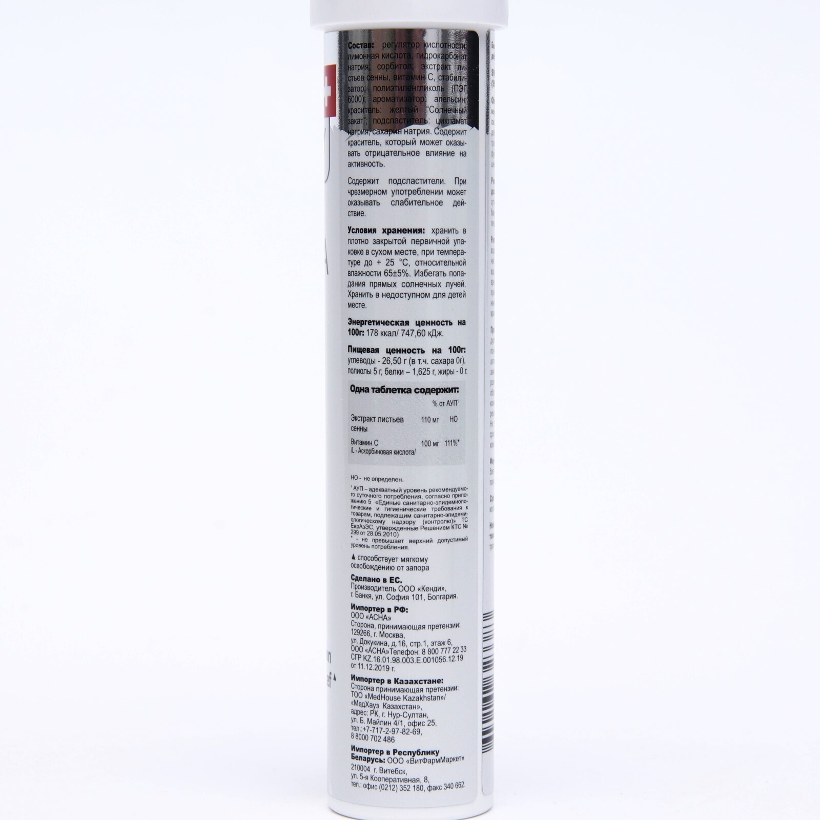 Состав: регулятор кислотности: лимонная кислота, гидрокарбонат натрия; сорбитол; экстракт листьев сенны, витамин С, стабилизатор: полиэтиленгликоль (ПЭГ 6000); ароматизатор: апельсин 10950-31; краситель: желтый “Солнечный закат” FCF E110; подсластитель: цикламат натрия, сахарин натрия. Cодержит краситель, который может оказывать отрицательное влияние на активность.