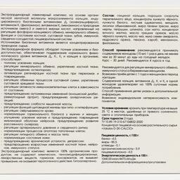Состав: глицинат кальция, порошок скорлупы перепелиного яйца, концентраты кунжута чёрного, кунжута белого, листьев одуванчика, миндаля, лисички обыкновенной, жира печени трески, жира нерпы, петрушки, шпината, сои натто, концентрат яичного желтка, масло грецких орехов, масло чёрного кунжута, масло чиа, мука семян амаранта, кедрового ореха, пекана, кэроб, менахинон, филлохинон.