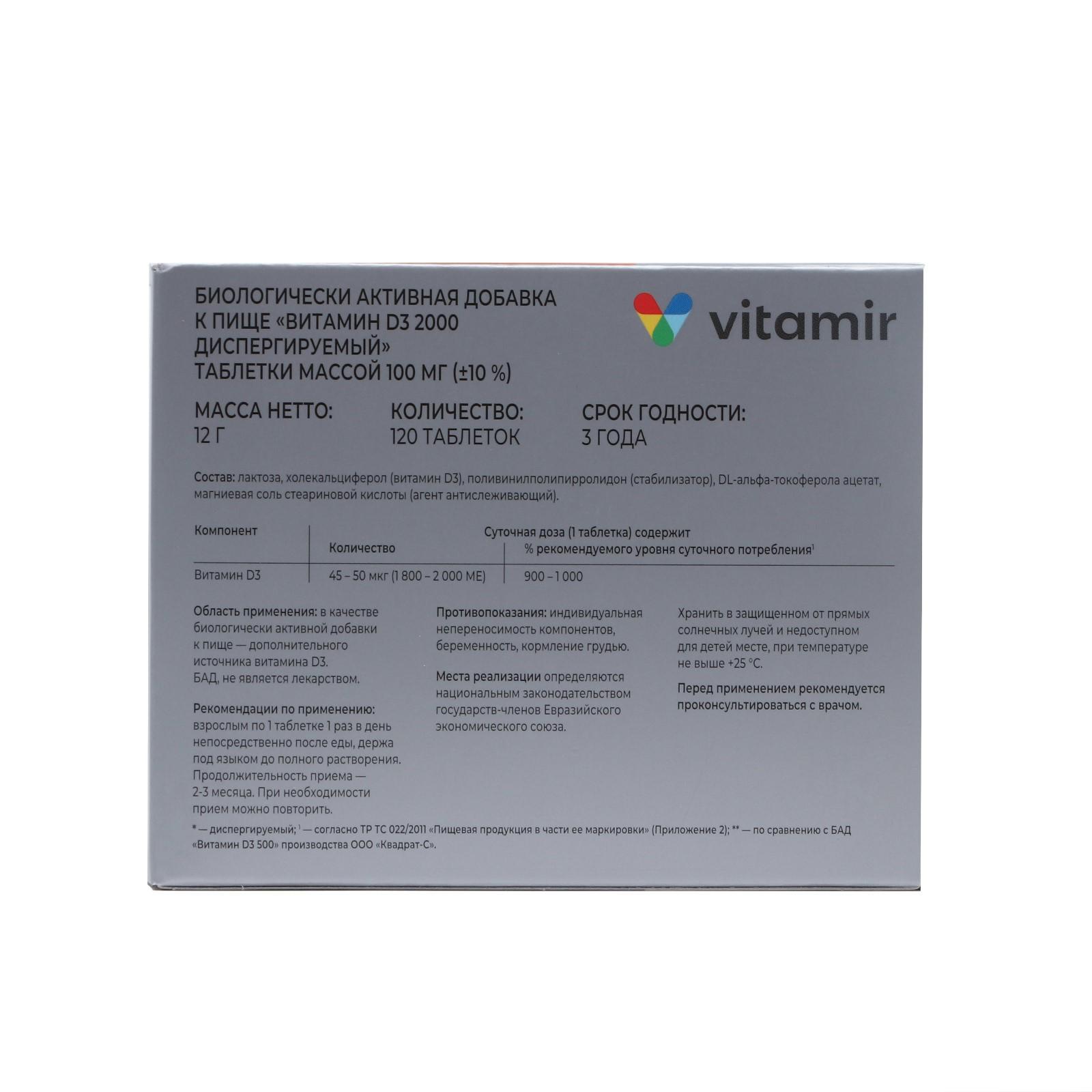 Витамин D3 2000 МЕ ВИТАМИР, 120 таблеток