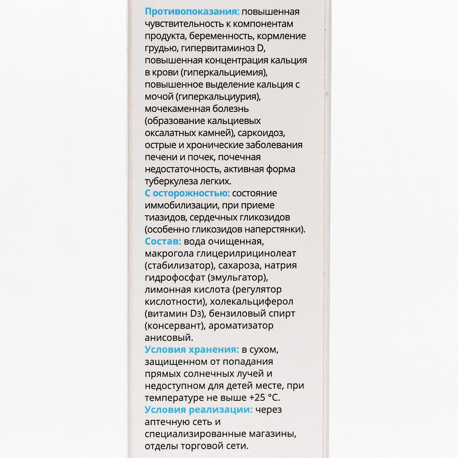 Состав: вода очищенная, макрогола глицерилрицинолеат (стабилизатор), сахароза, натрия гидрофосфат (эмульгатор), лимонная кислота (регулятор кислотности), холекальциферол (витамин D3), бензиловый спирт (консервант), ароматизатор анисовый.