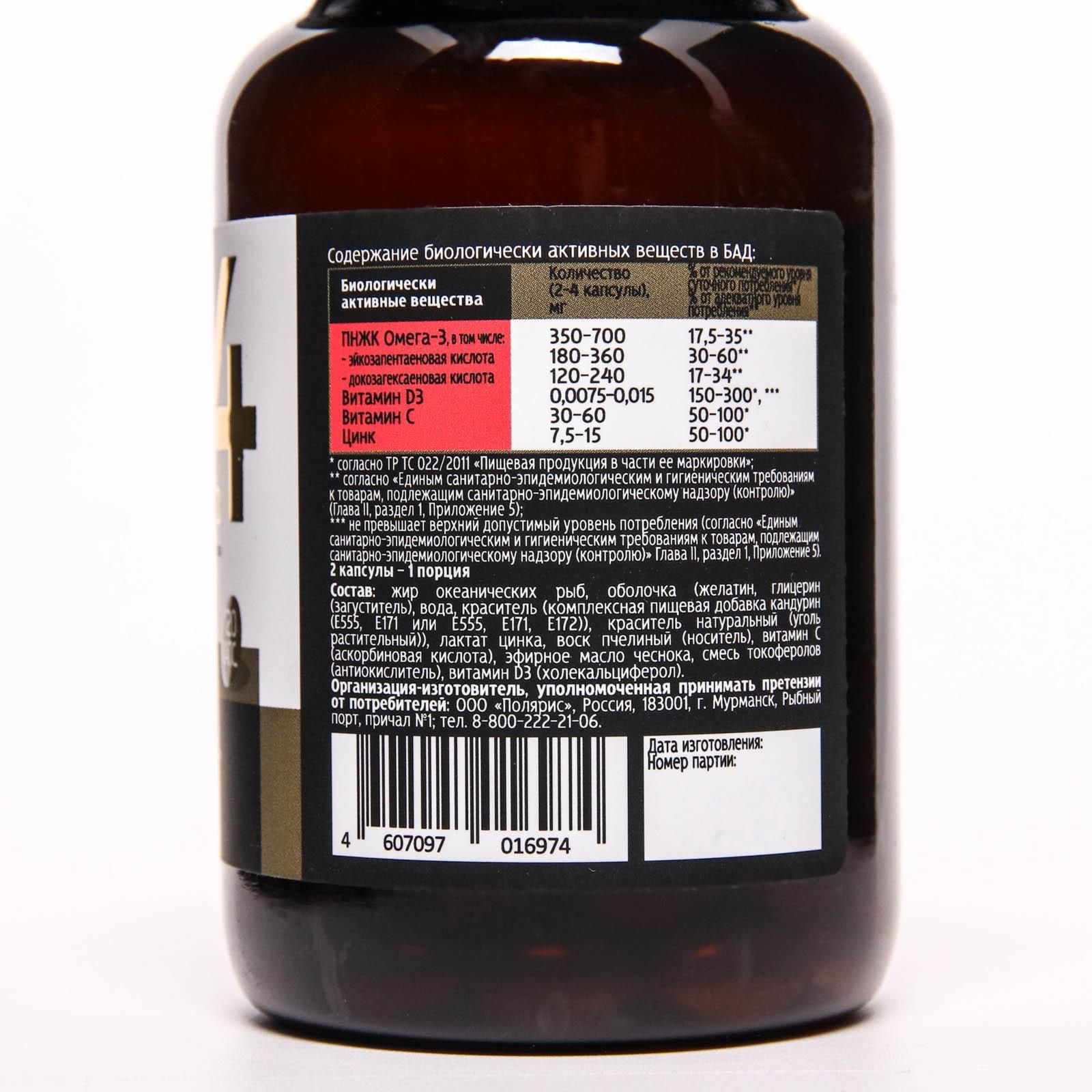 Состав: жир океанических рыб, оболочка (желатин, глицерин (загуститель), вода, краситель (комплексная пищевая добавка кандурин (Е555, Е171 или Е555, Е171, Е172)), краситель натуральный (уголь растительный)), лактат цинка, воск пчелиный (носитель), витамин С (аскорбиновая кислота), эфирное масло чеснока, смесь токоферолов (антиокислитель), витамин D3 (холекальциферол).