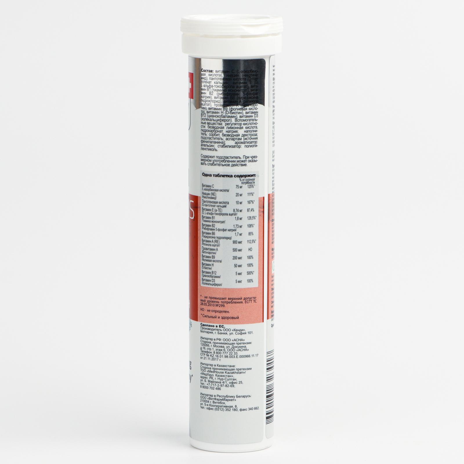 Состав: витамин С (L-аскорбиновая кислота), ниацин (никотинамид), пантотеновая кислота (D-пантотенат кальция), витамин Е (D, L-альфа-токоферола ацетат), витамин В1 (тиамина мононитрат), витамин В2 (рибофлавин 5-фосфат натрия), витамин В6 (пиридоксина гидрохлорид), витамин А (ретинола ацетат), провитамин А (бета-каротин), витамин В9 (фолиевая кислота), витамин Н (D-биотин), витамин В12 (цианокобаламин), витамин D3 (холекальциферол). Кислота (лимонная), регулятор кислотности (бикарбонат натрия), наполнитель (сорбит, декстроза), подсластитель (аспартам-источник фенилаланина), аромат (апельсин), стабилизатор (полиэтиленгликоль), провитамин А (бета-каротин), витамин Е (D, L-a-токоферола ацетат), витамин D3 (холекалциферол), витамин В2 (рибофлавин 5-фосфат натрия), витамин Н (D-биотин).