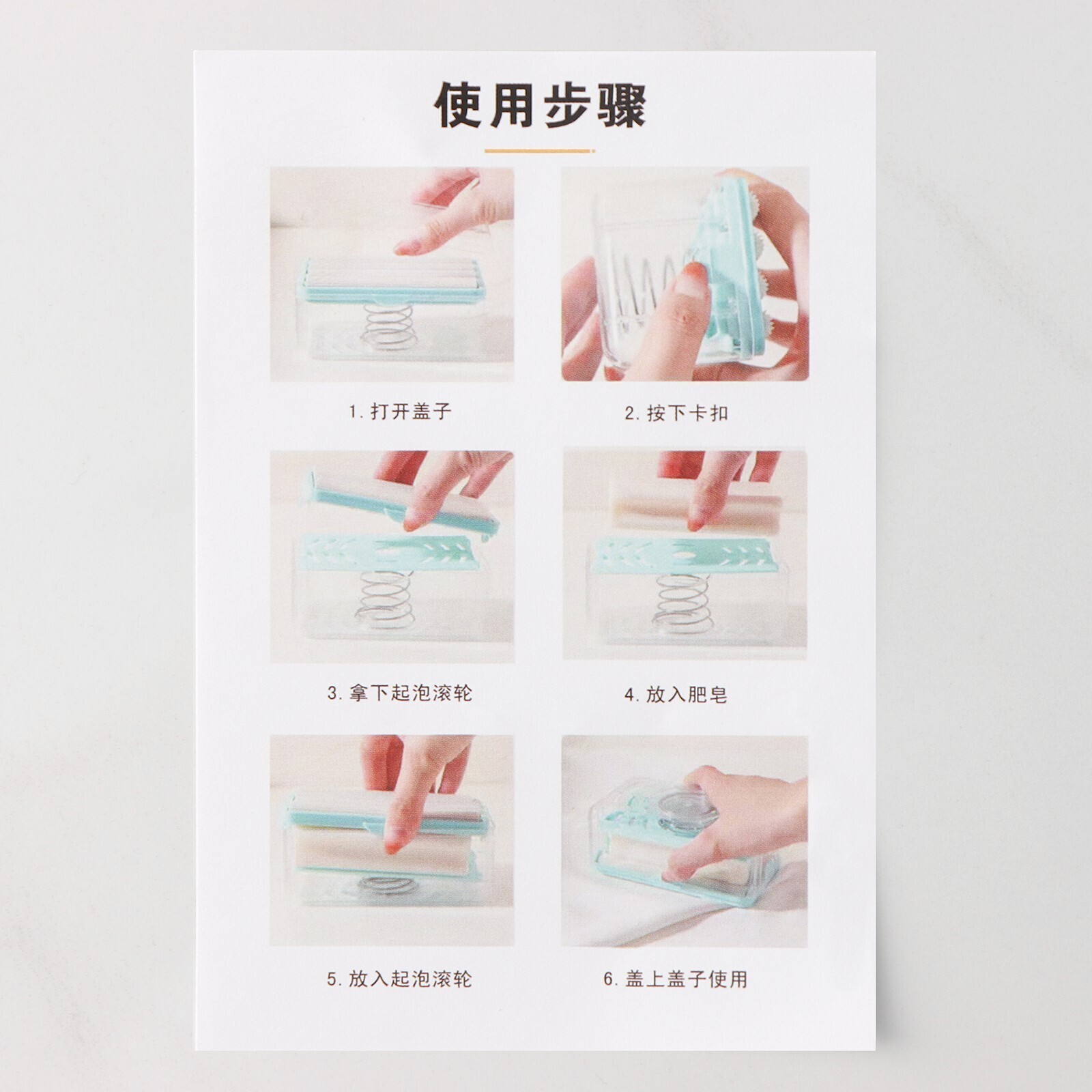 Чтобы собрать щётку, сначала вставьте в ёмкость подставку с пружинкой. На неё положите мыло, а затем закройте ёмкость крышкой с роликовыми вставками. Намочите валики водой. Щётка готова к использованию!