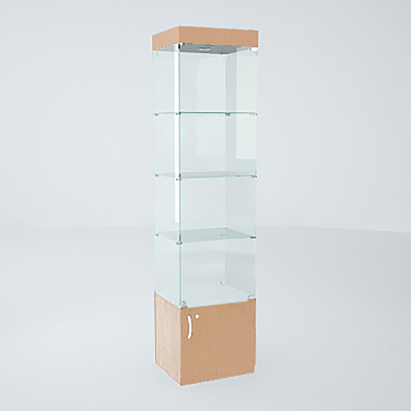 Витрина стеклянная с дверками, крыша ДСП со встроенным точечным светильником, в комплекте замки на дверках. Боковые стенки - стекло 5 мм, полки - стекло 5 мм, накопитель - ЛДСП 500 мм.