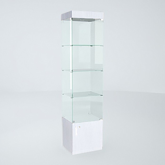 Витрина стеклянная с дверками, крыша ДСП со встроенным точечным светильником, в комплекте замки на дверках. Боковые стенки - стекло 5 мм, полки - стекло 5 мм, накопитель - ЛДСП 500 мм.