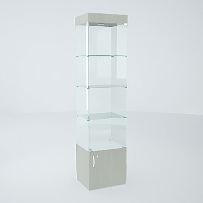 Витрина стеклянная с дверками, крыша ДСП со встроенным точечным светильником, в комплекте замки на дверках. Боковые стенки - стекло 5 мм, полки - стекло 5 мм, накопитель - ЛДСП 500 мм.
