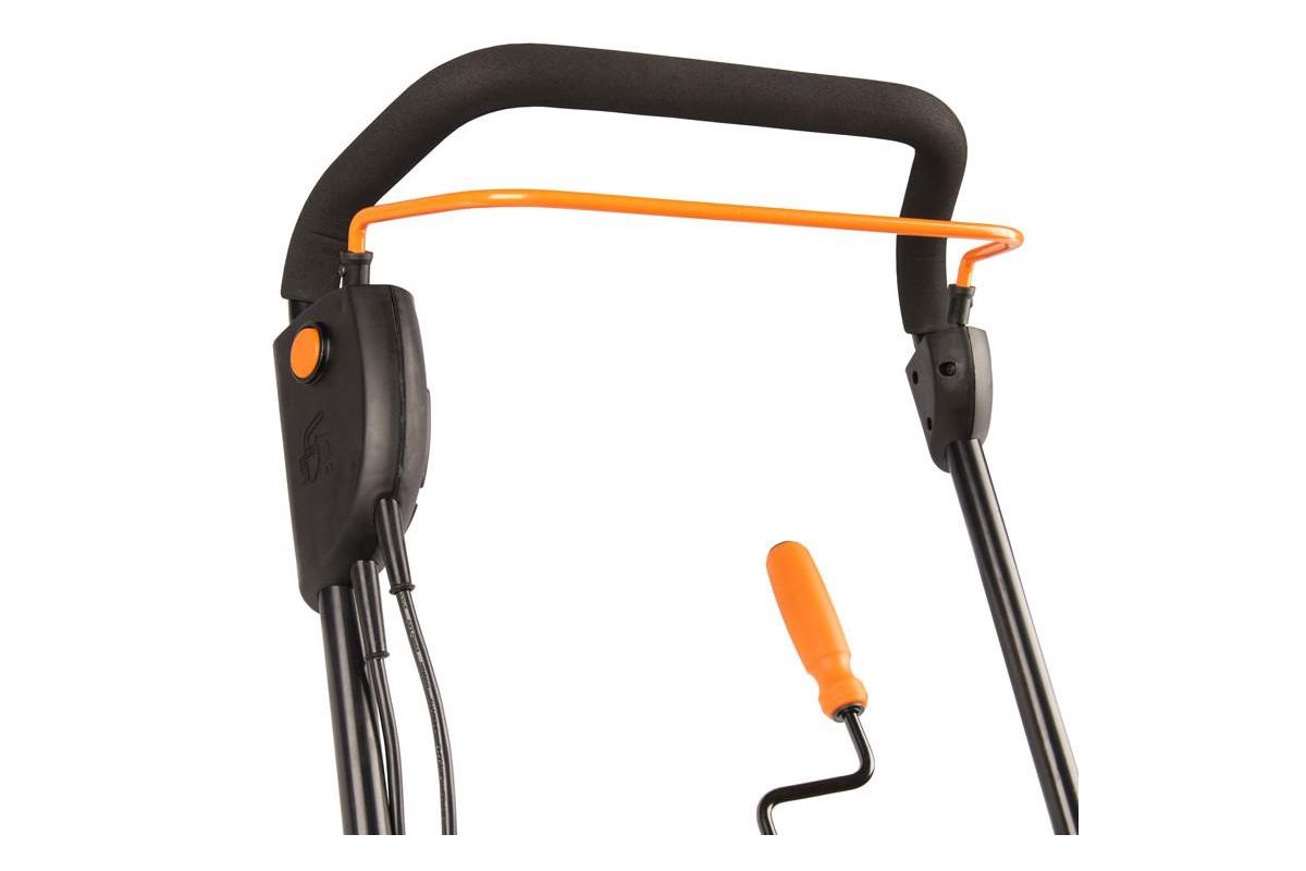Безопасный выключатель на рукоятке снегоуборщика. Исключает непреднамеренный пуск устройства.