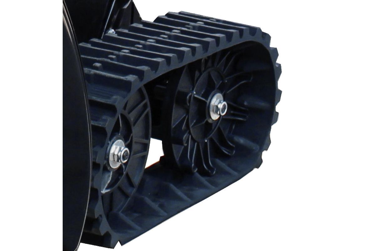 Снегоуборщик самоходный, т.е. двигатель управляет не только шнеками, но и колесами. Предусмотрено 6 скоростей движения вперед и 2 назад. От пользователя требуется только задавать направление и периодически поворачивать — никаких усилий прикладывать не нужно. Передвигается снегоуборщик на гусеницах, а значит проблем с прохождением занесенных снегом участков не возникнет.