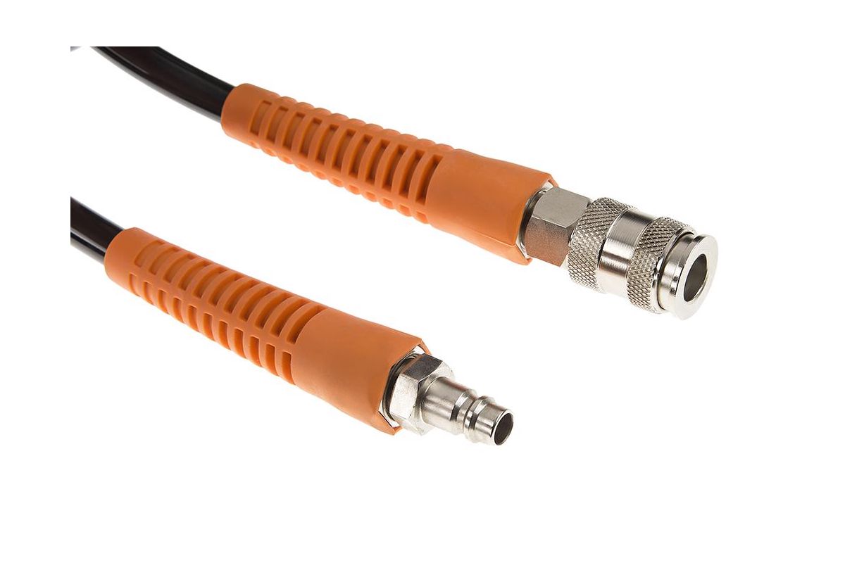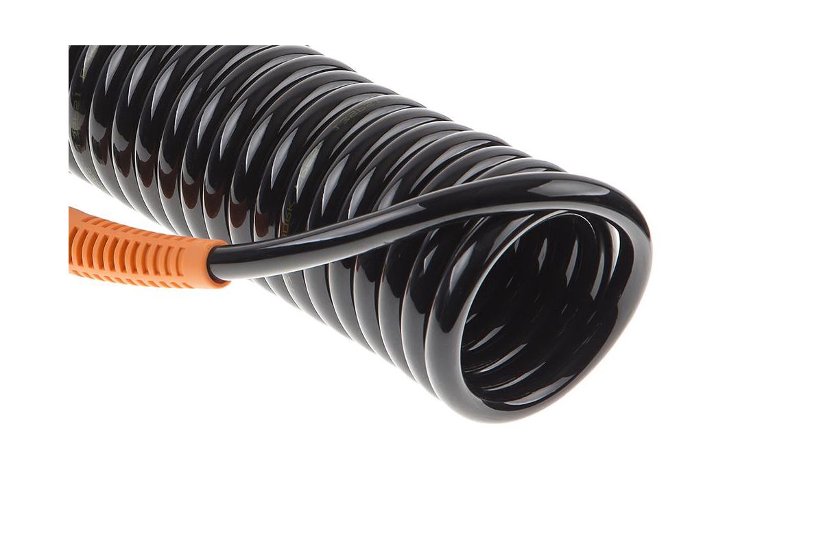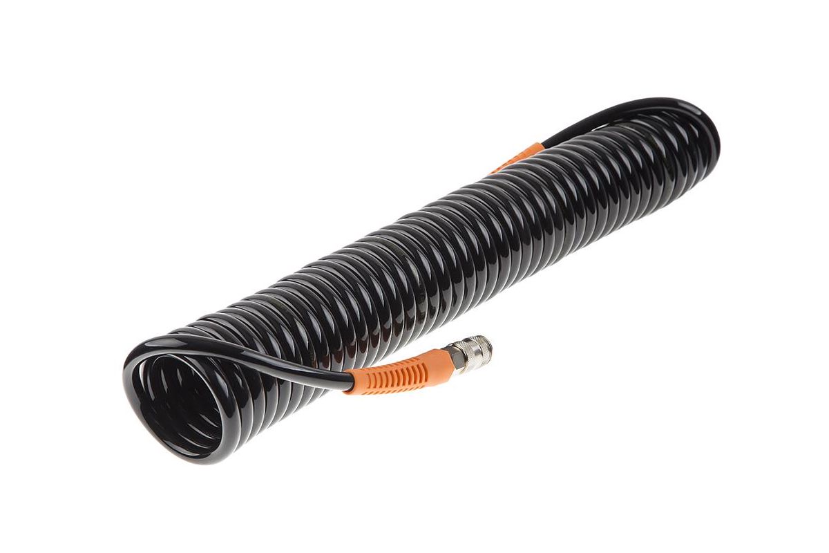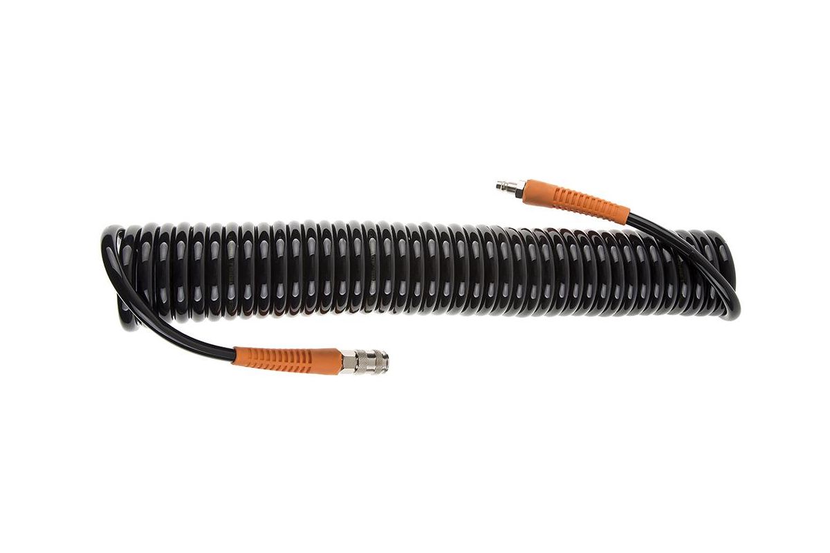 Шланг пневматический полиуретановый с фитингами БРС. Витой, длина до 10 метров, 8*12мм, рабочее давление 135PSI (10бар). Кратковременное давление до 800PSI. Черный