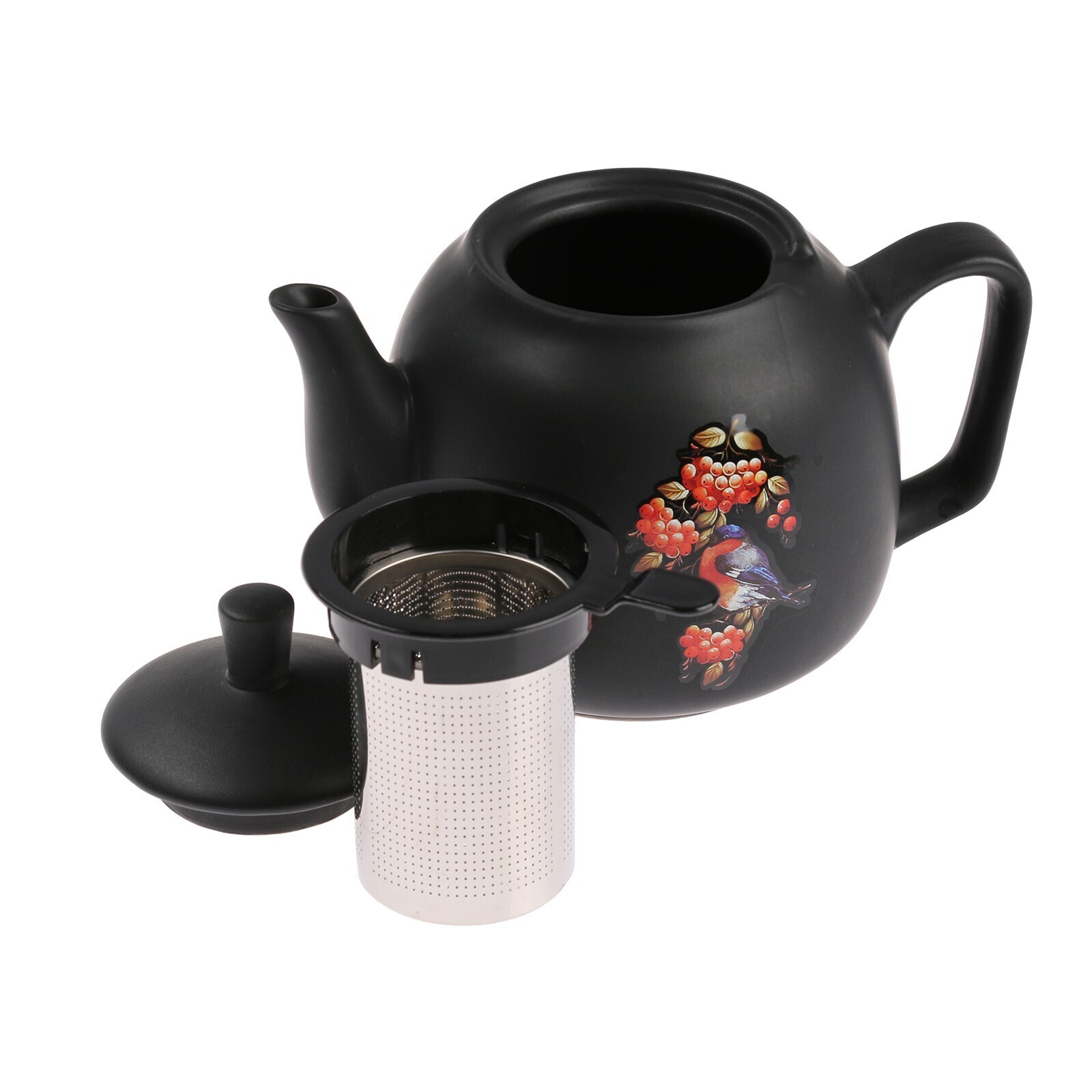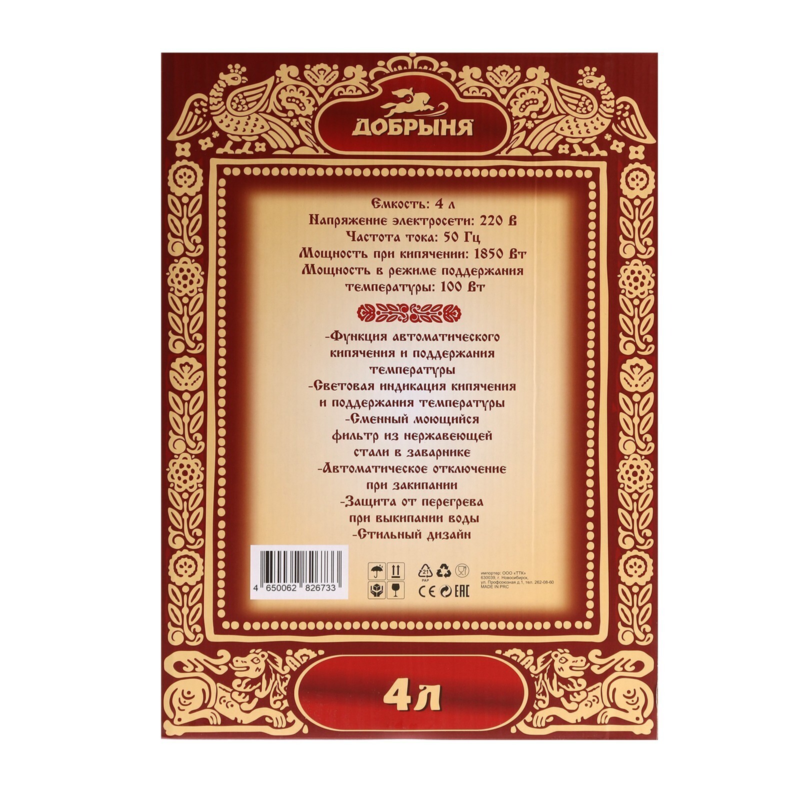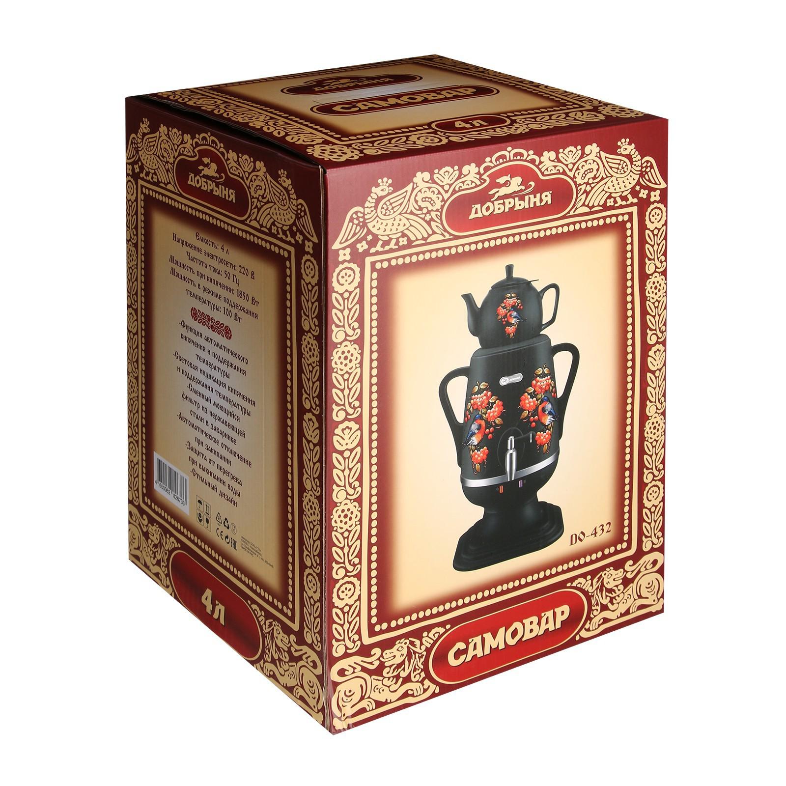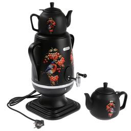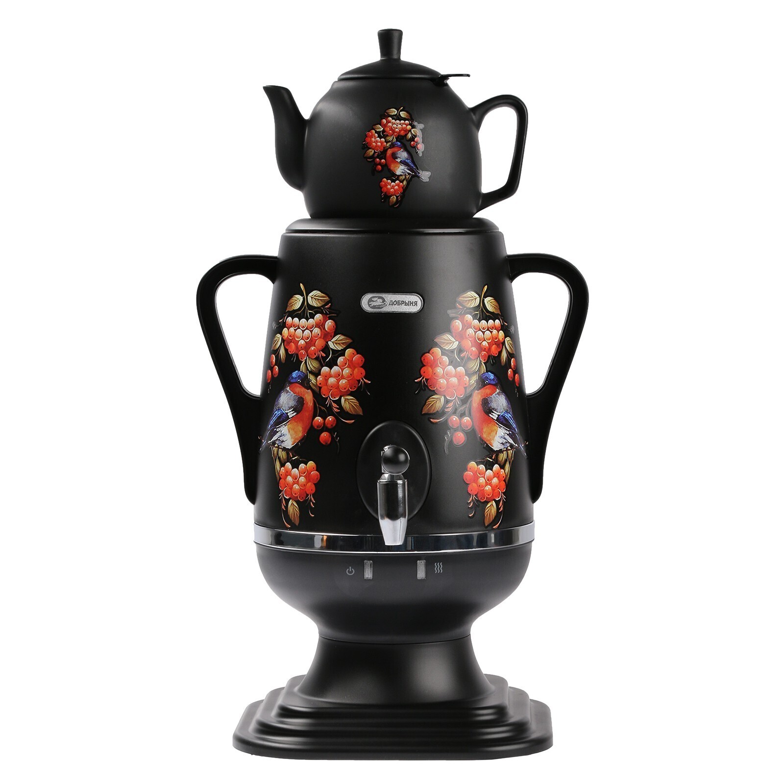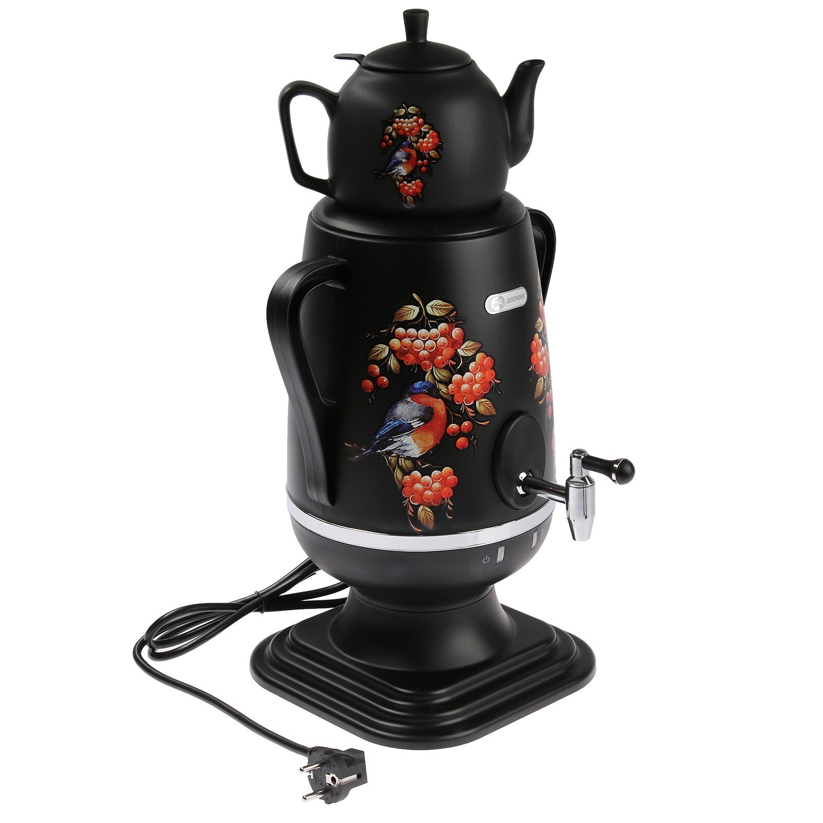 Самовар электрический "Добрыня" DO-432, пластик, 4 л, 1850 Вт, чёрный с рисунком "Снегирь"