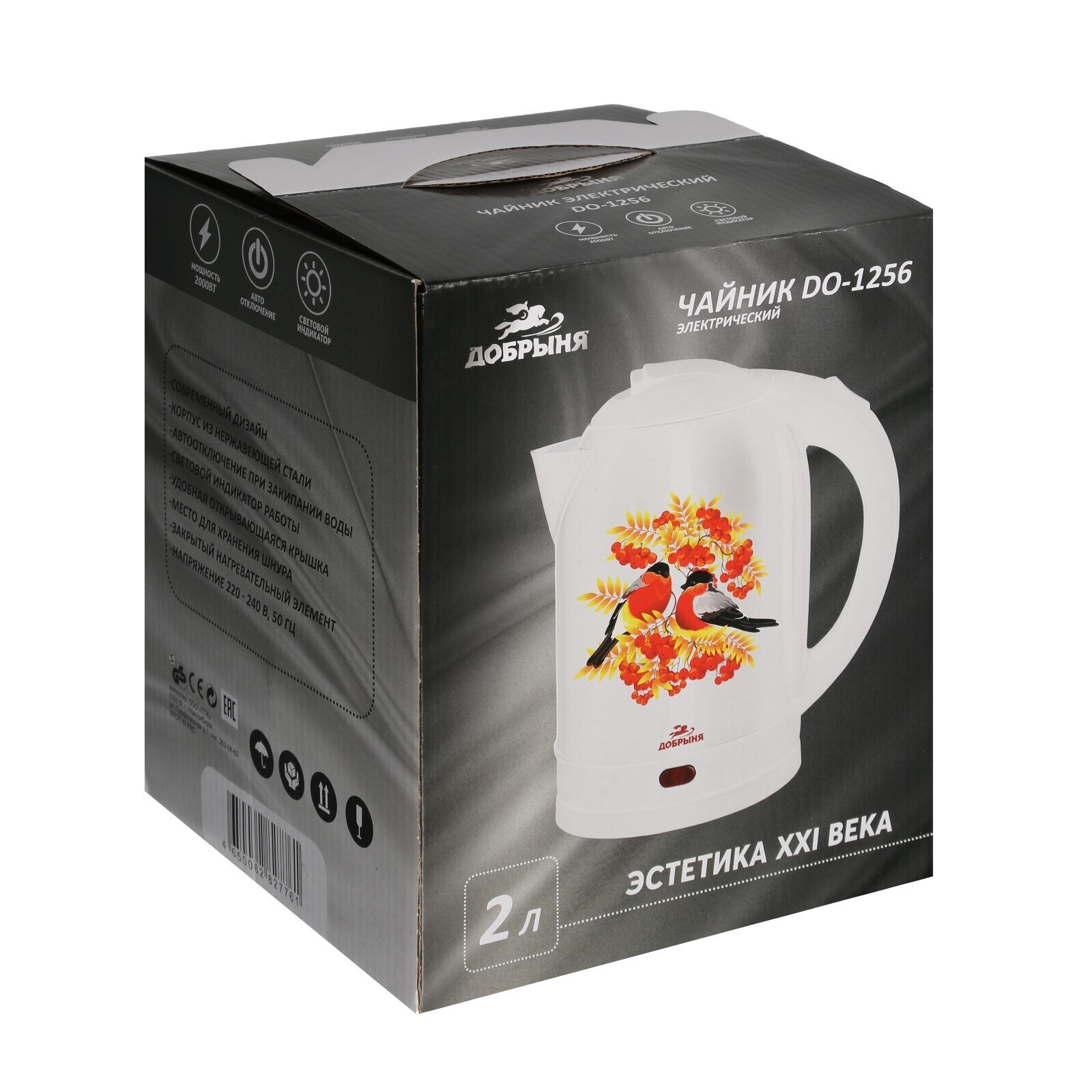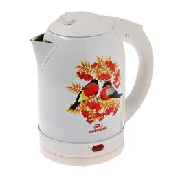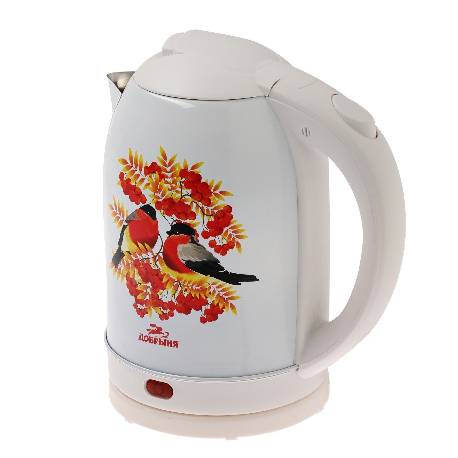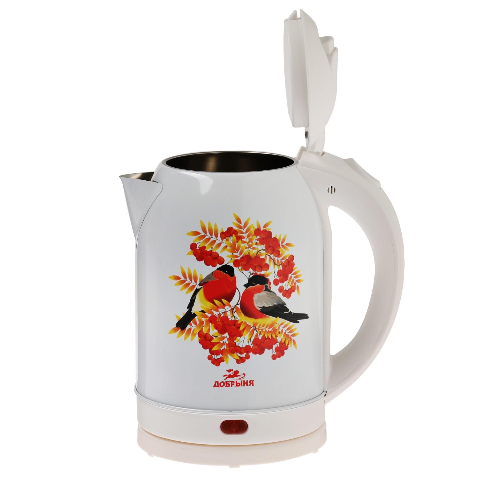 Чайник электрический "Добрыня" DO-1256, металл, 2 л, 2000 Вт, белый с рисунком "Снегири"