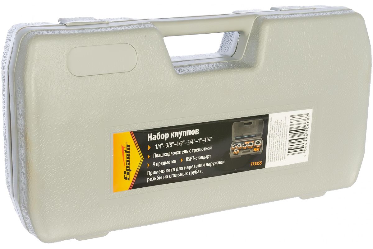Набор клупп SPARTA 773355 1/4''-3/8''-1/2''-3/4''-1''-1 1/4'' + плашкодержатель с трещоткой, 9 предм.