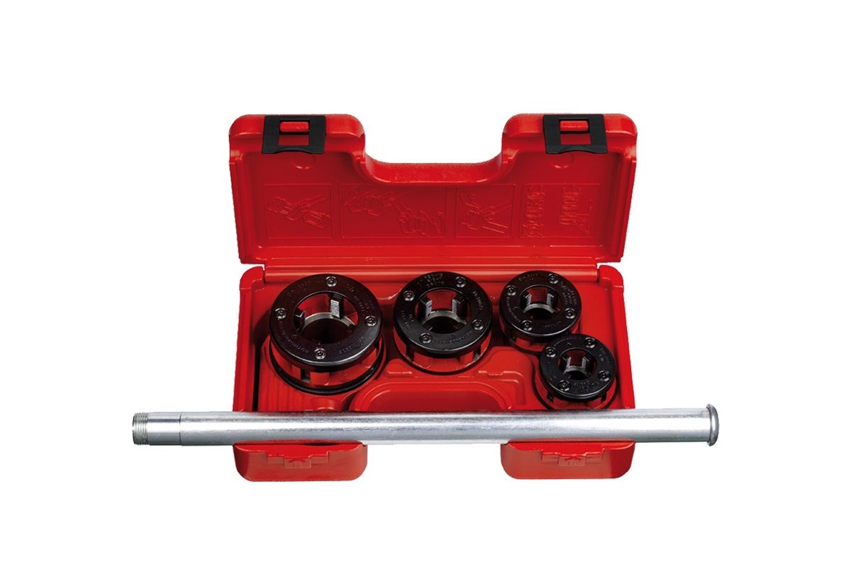 набор с резьбонарезными головками BSPT R от 1/2'' до 1.1/4” и трещоткой с неразборной рукояткой в пластиковом кейсе. Клупп с трещоткой (малое 8-гранное крепление) с неразборной рукояткой. Головки могут быть размещены с обеих сторон трещотки. Подходит для работы в ограниченном пространстве.