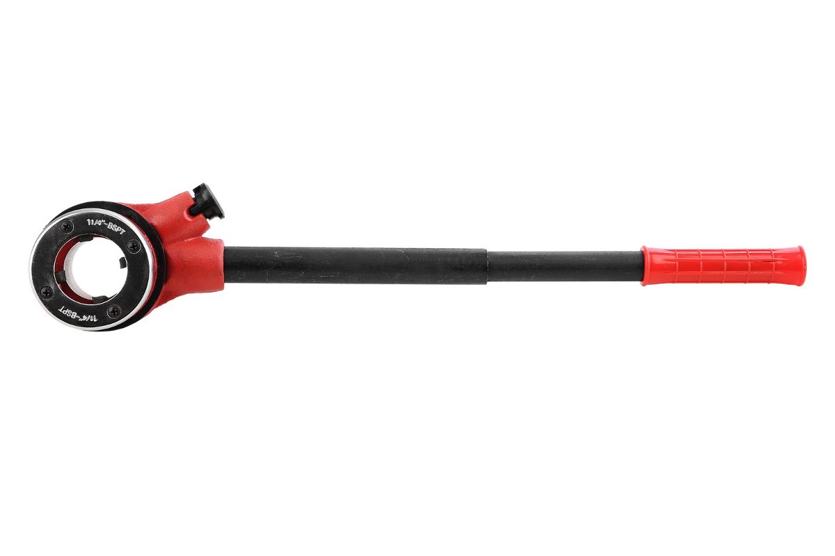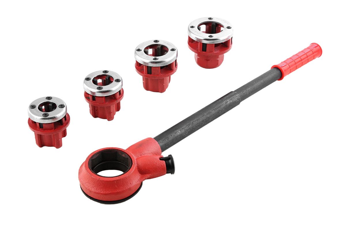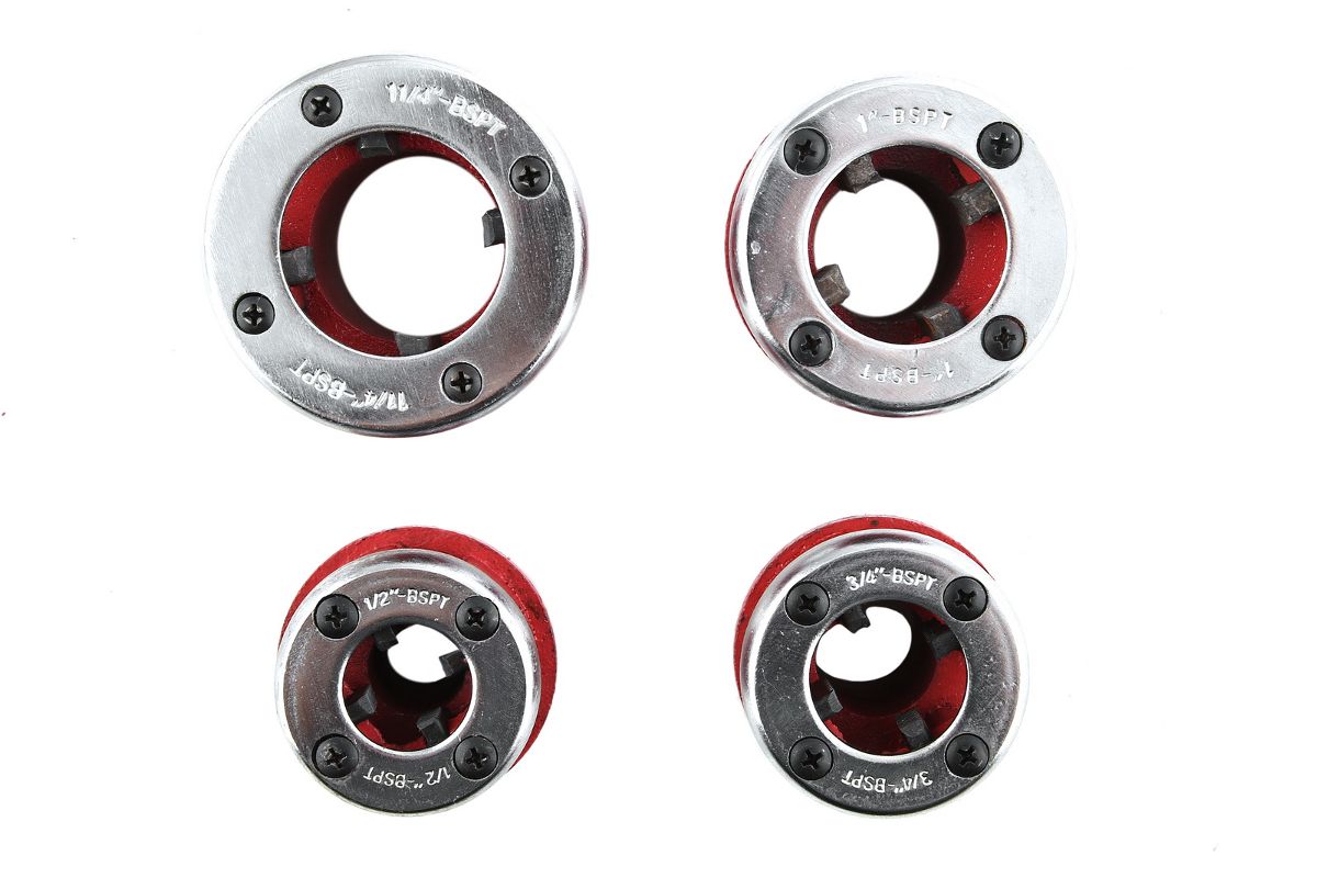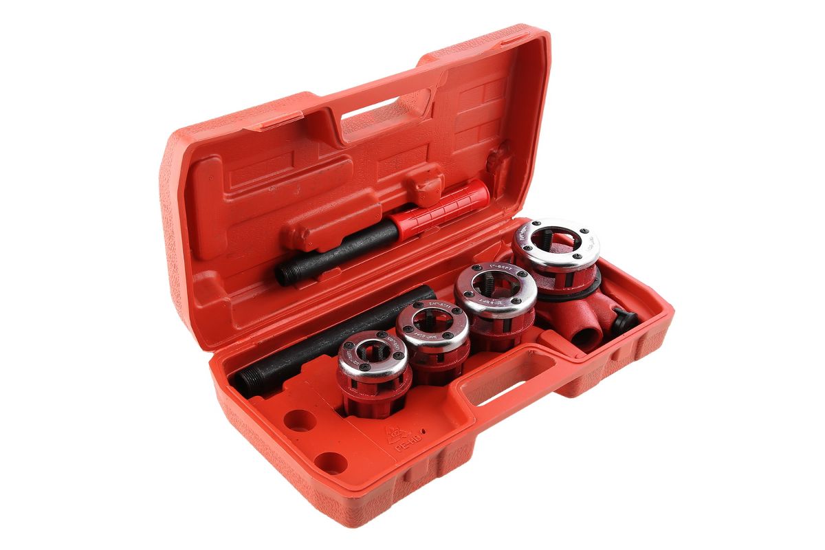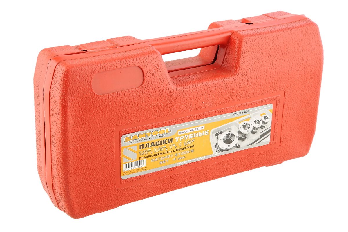 Набор клупп SANTOOL 032115-004 используется при нарезке дюймовой резьбы на стальных трубах диаметрами 12-32 мм. Для фиксации плашек 1/2', 3/4', 1' и 1¼' используется плашкодержатель с трещоткой. Все элементы набора выполнены из стали. Вес набора — 4,8 кг.
