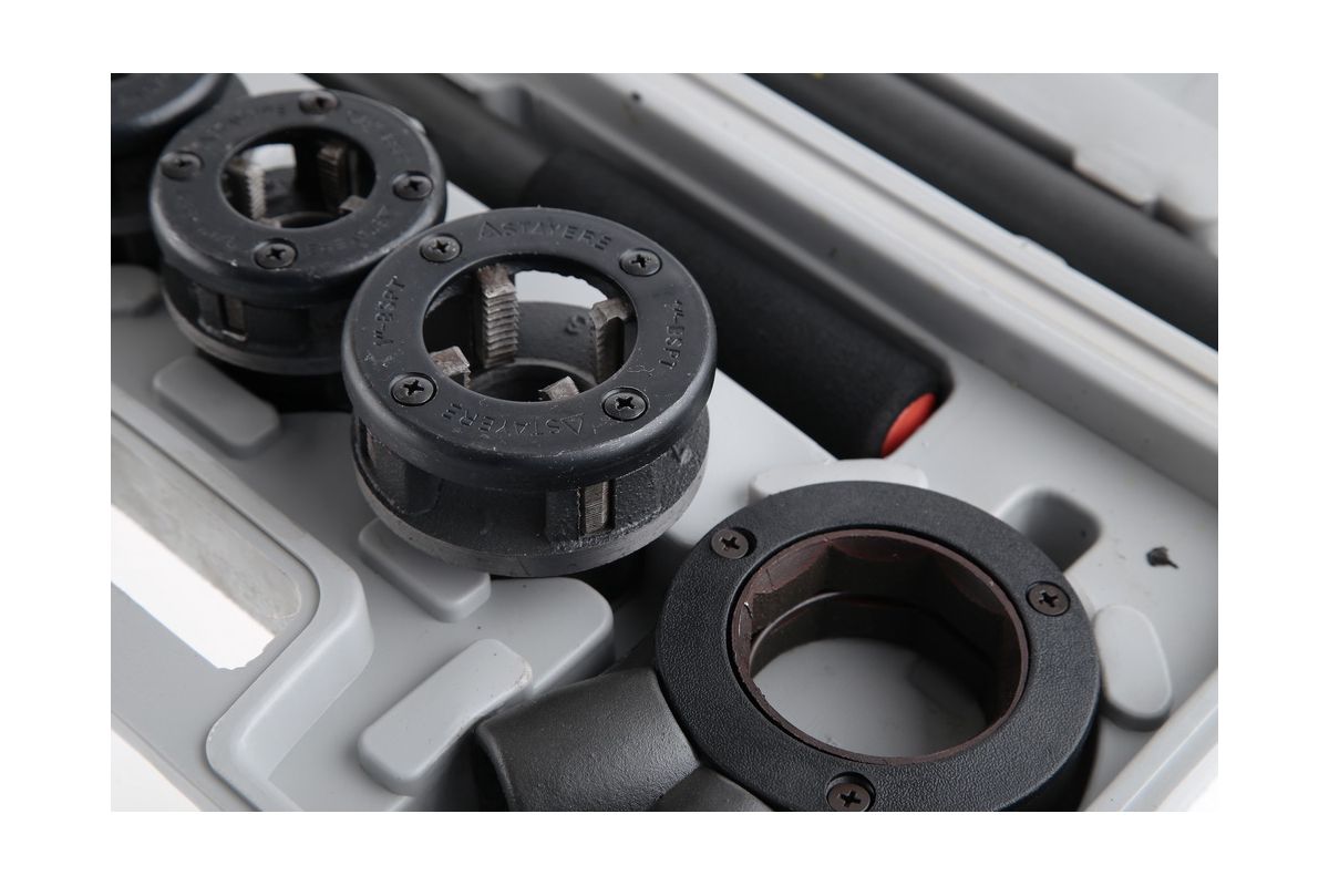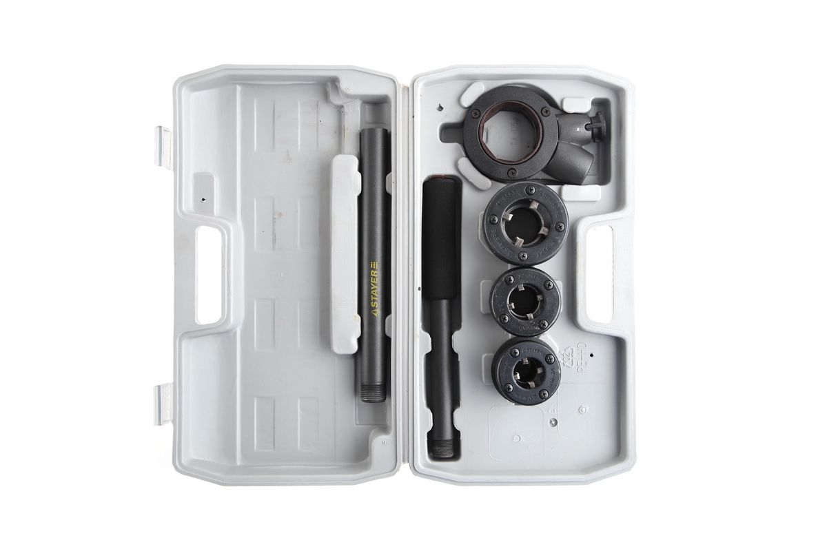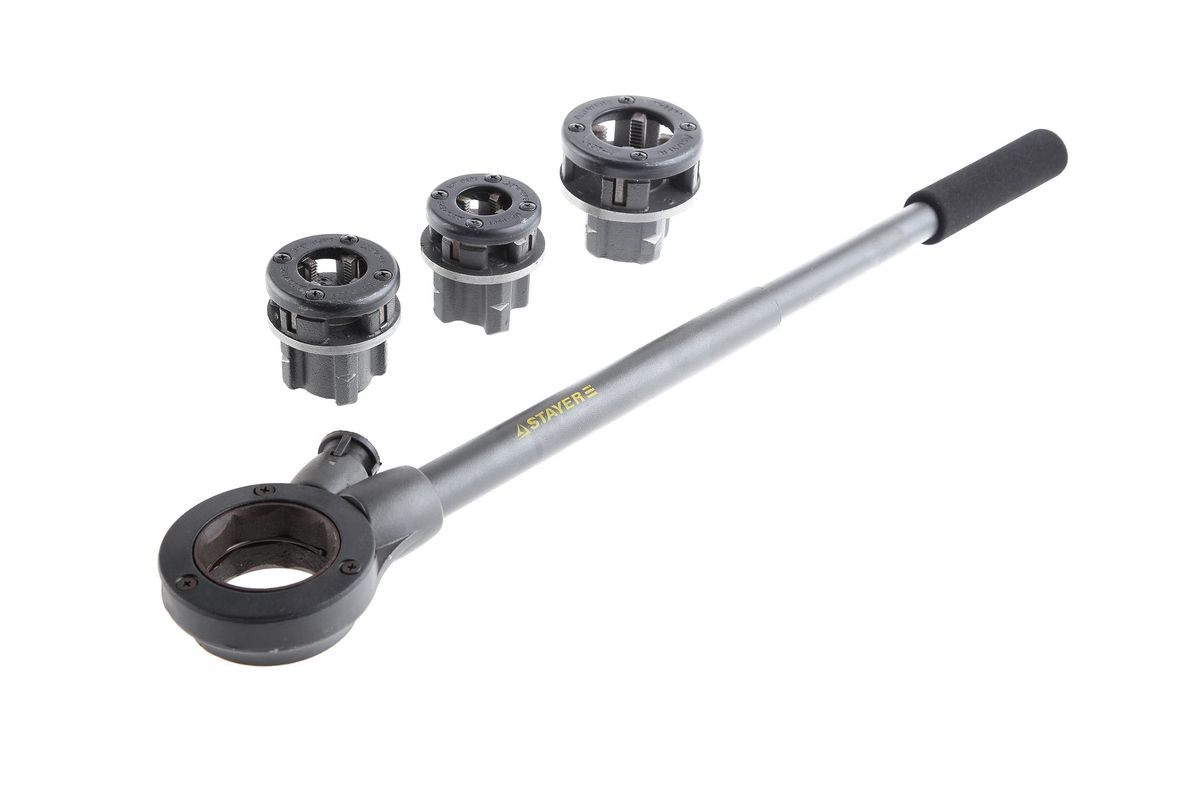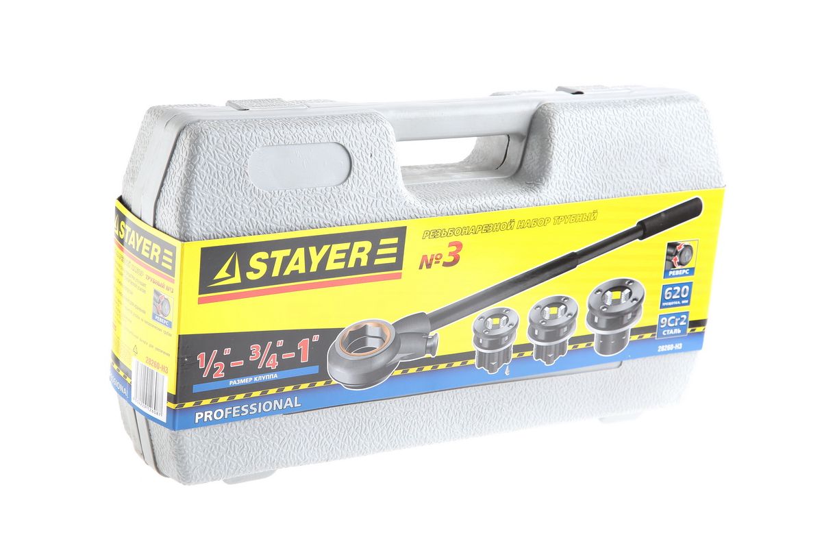 STAYER 28260-H3 – резьбонарезной трубный набор инструментов бытового класса. В комплекте — 3 резьбонарезных головки для работы с металлическими трубами диаметром 1", 3/4" и 1/2". Реверсивная трещотка имеет ручку эргономичной формы. За счет этого она удобно лежит в руке и уменьшает прикладываемое усилие. Набор поставляется в практичном пластиковом кейсе. Вес модели – 3,9 кг.