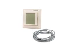 Встраиваемый сенсорный электронный термостат в корпусе бежевого цвета с диапазоном регулировок +5...+45 °C, коммутируемым током контактов 16 A, внешним датчиком температуры 10 кОм. Совместим с Legrand серии Valena.