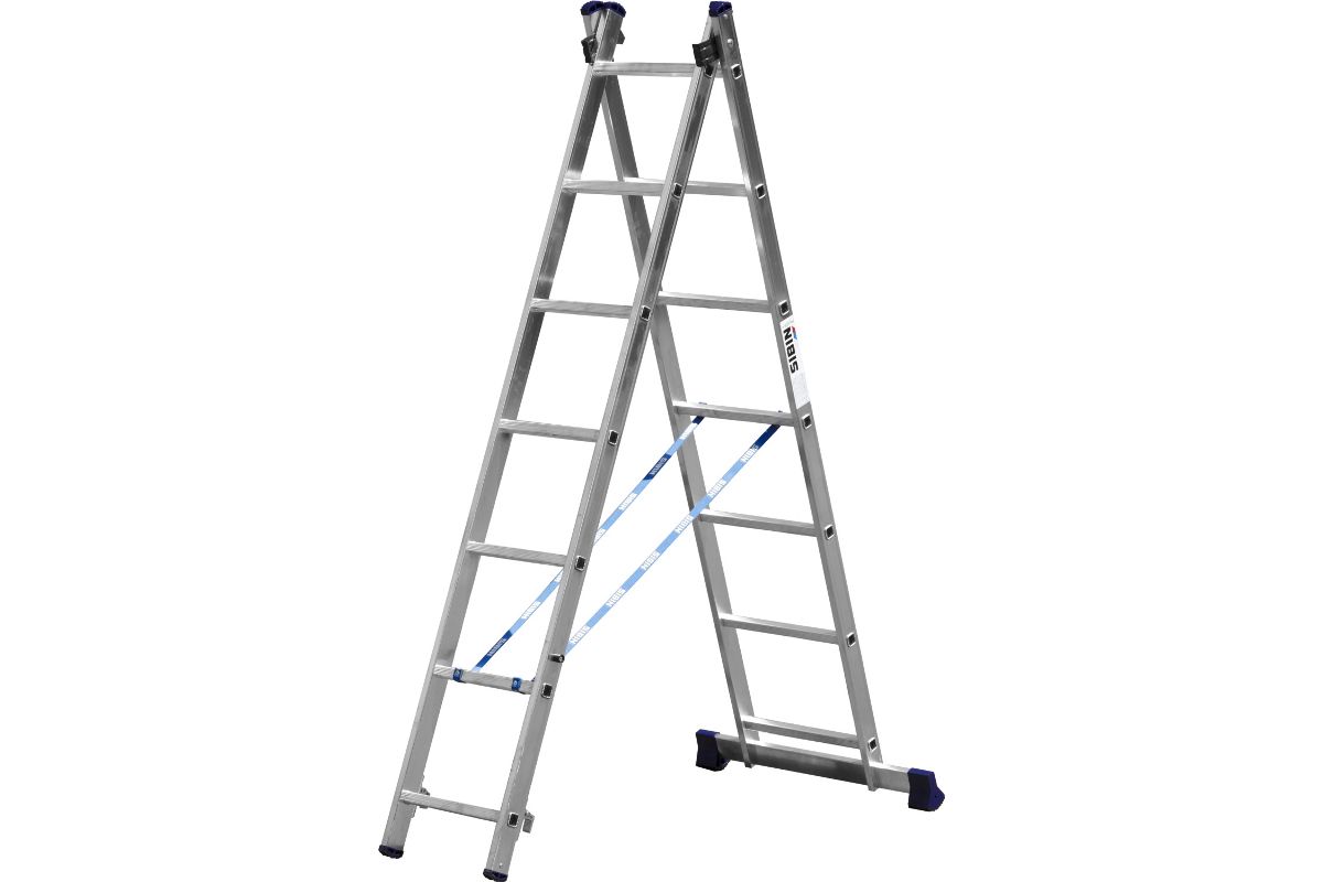 СИБИН 38823-07 – универсальная двухсекционная лестница из алюминия. Пригодится, чтобы покрасить стены, установить молдинги, достать вещи с верхних полок или собрать урожай на даче. Максимальная высота лестницы – 3 метра. Вес – 6 кг. Количество ступеней на секции – 7 шт.