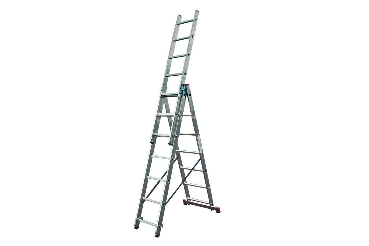 Трехсекционная, универсальная алюминиевая лестница. Может применяться в качестве приставной, раздвижной лестницы, а также стремянки