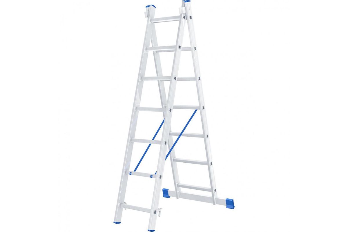 Алюминиевая двухсекционная лестница СИБРТЕХ 2х7 ступеней 97907 подходит для выполнения работ на высоте до 3,6 м.