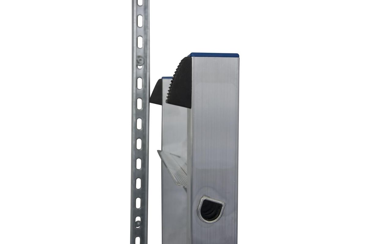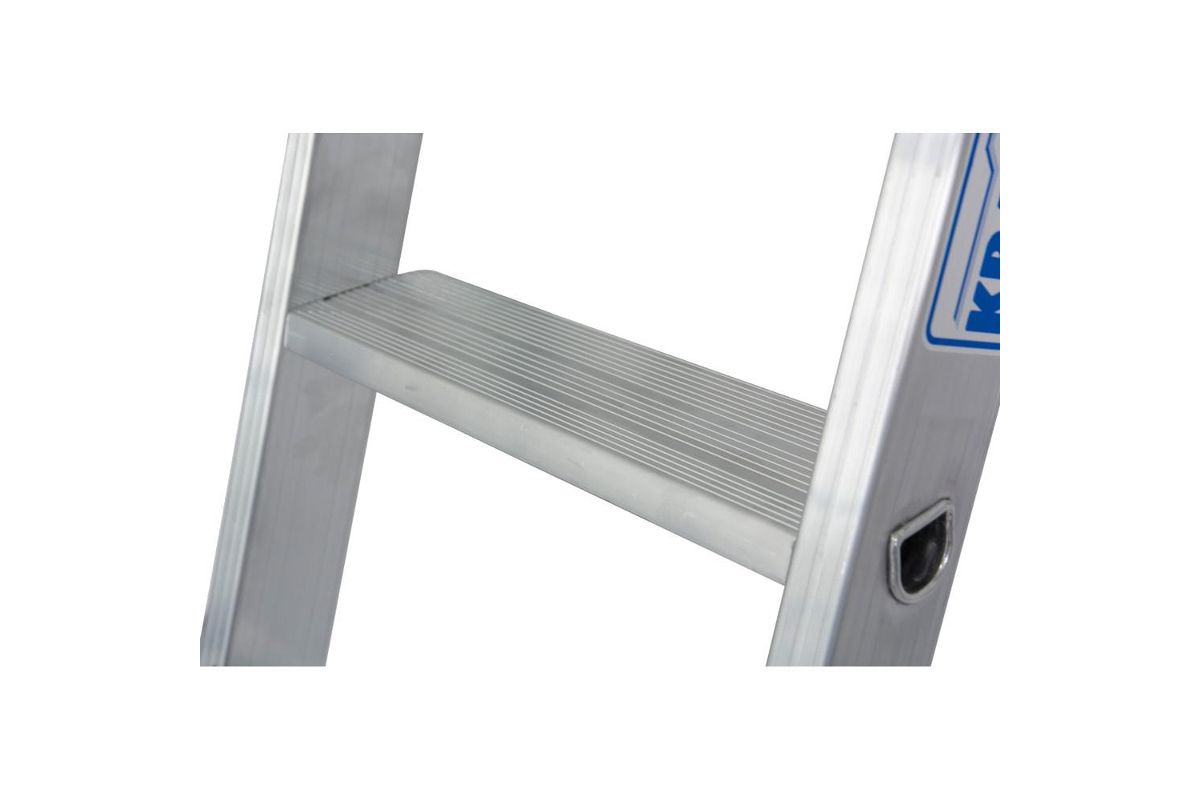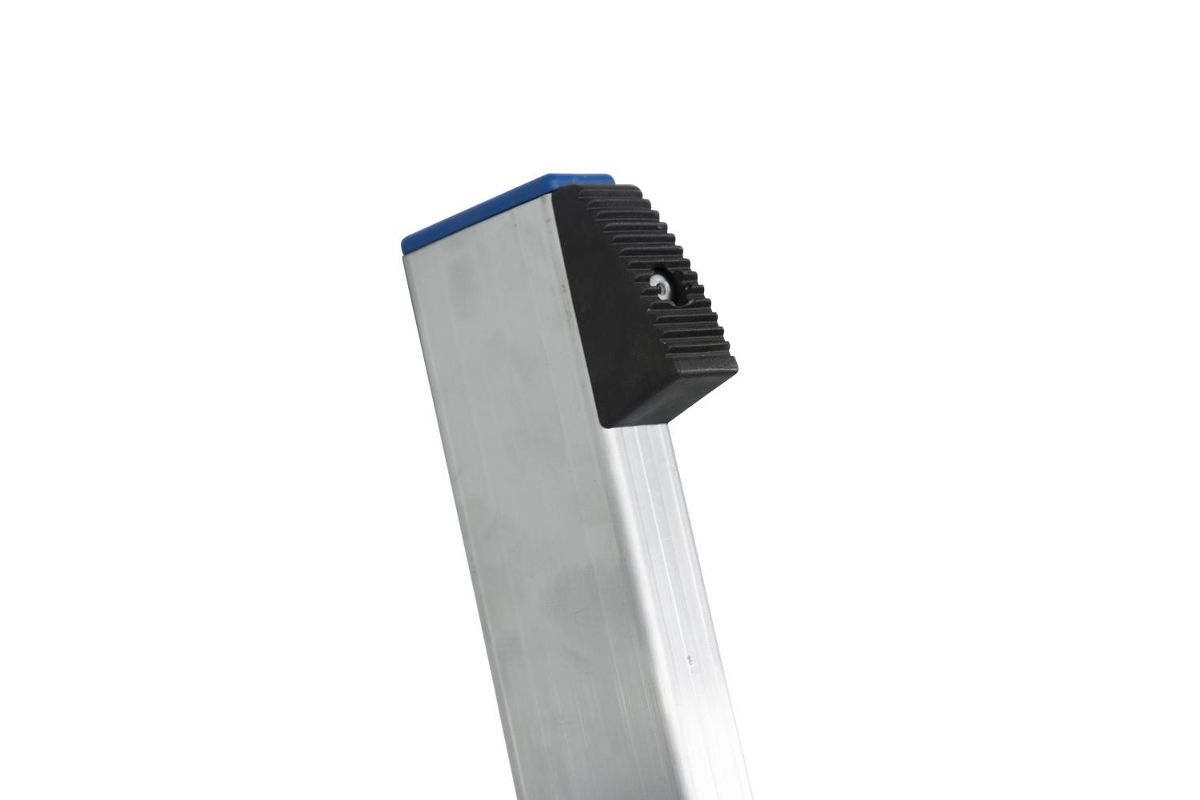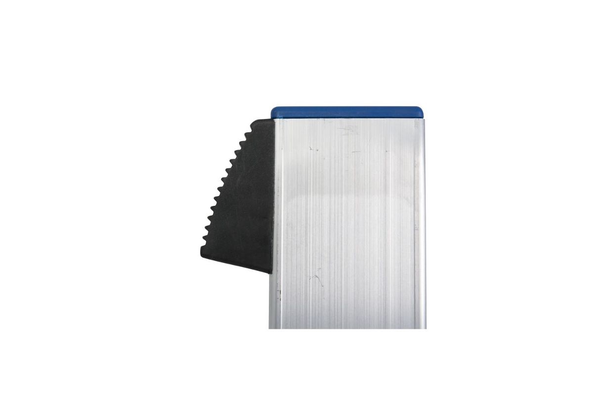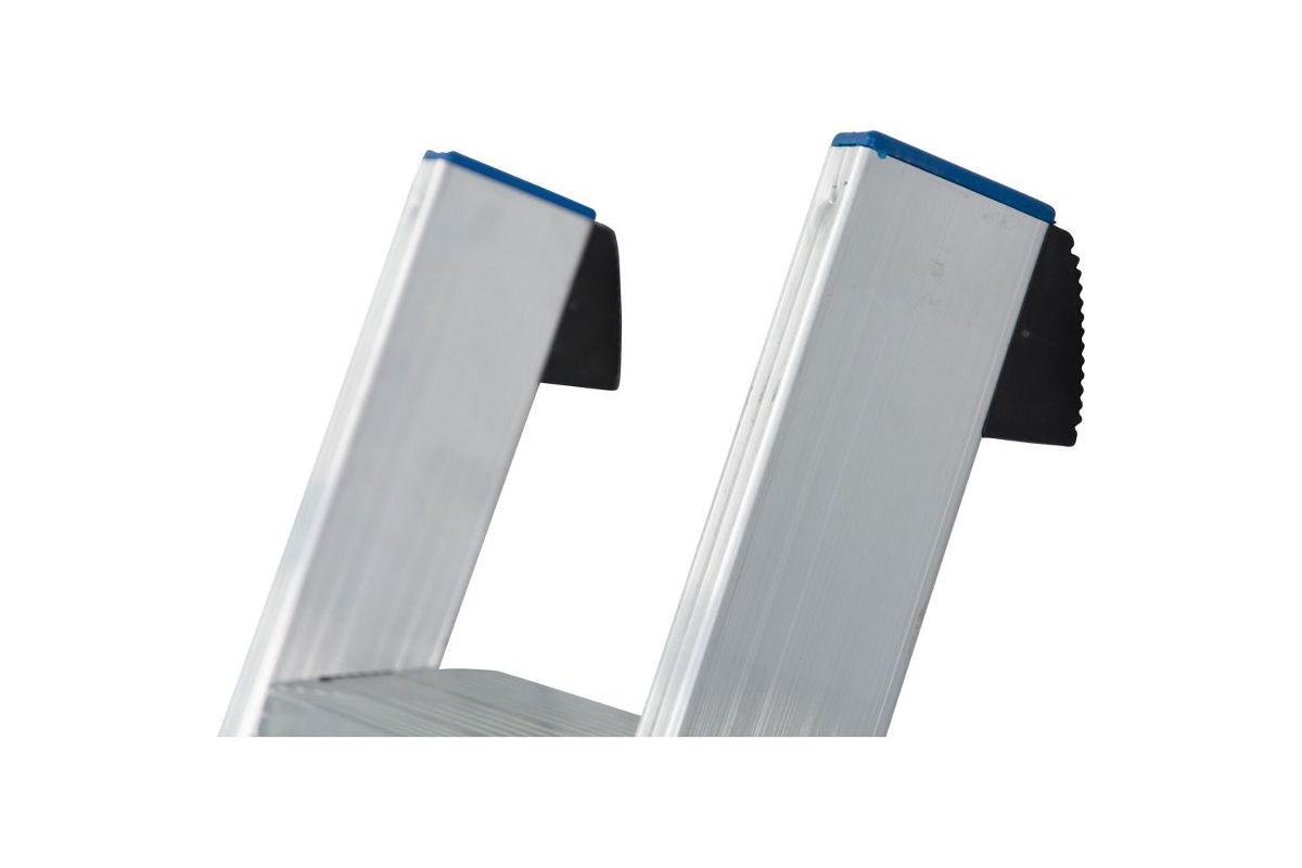 Приставная лестница изготовлена из алюминия, который защищен специальным покрытием от коррозии и ржавчины. Верхними специальными накладками конструкция опирается на вертикальную опору, а нижними заглушками на пол или грунт. Изделие при этом не скользит и обеспечивает дополнительную страховку во время работы. Широкие профилированные ступени являются устойчивой площадкой и исключают соскальзывание стопы.
