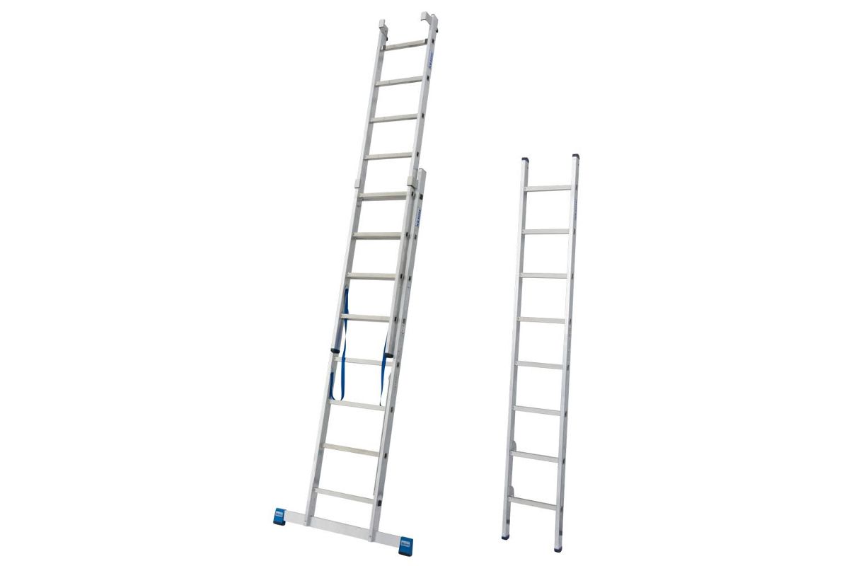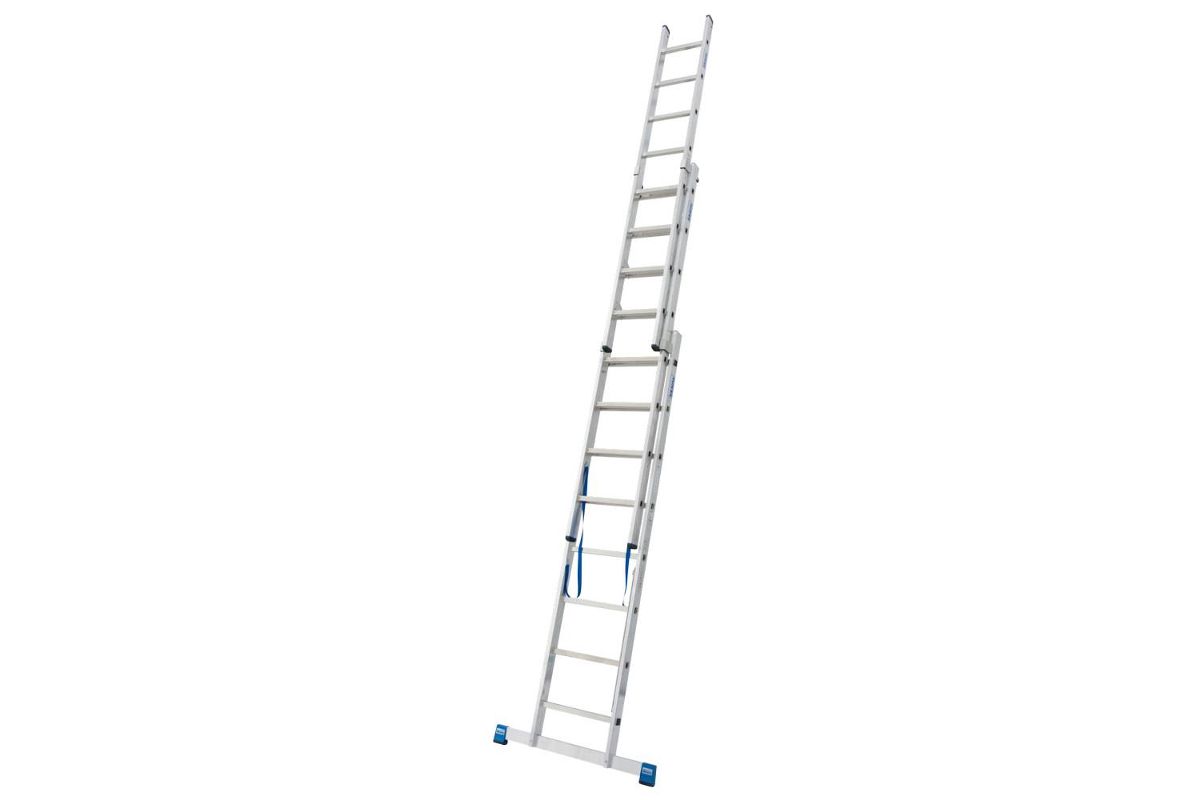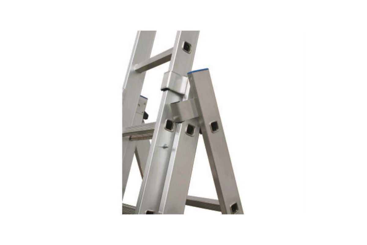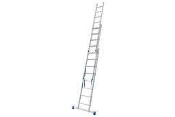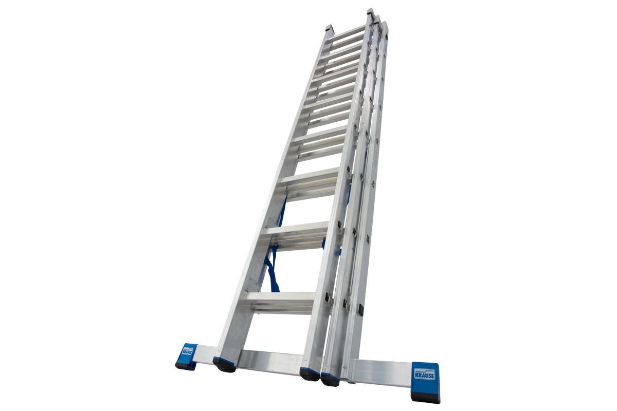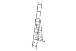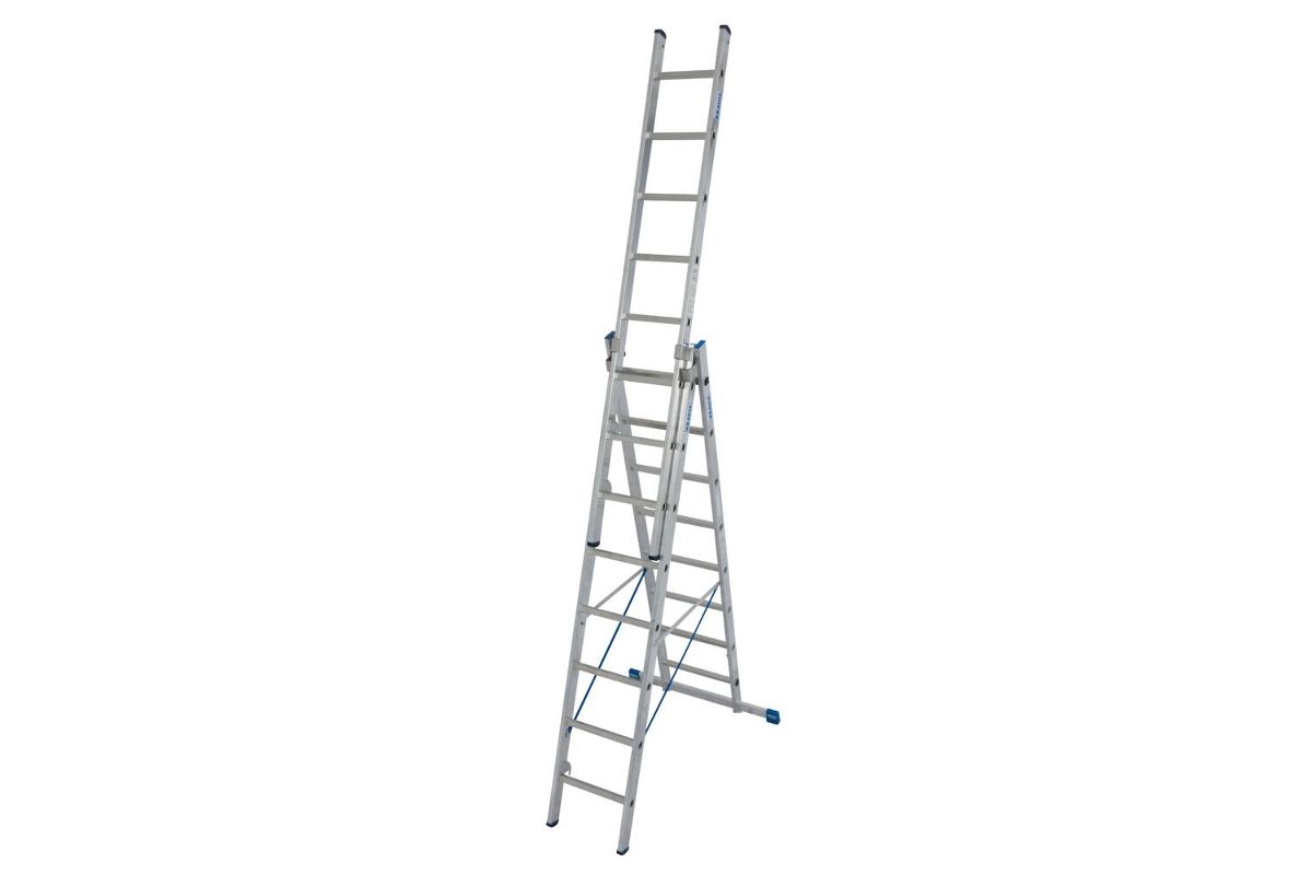 Трехсекционная универсальная лестница для профессионального использования. Используется как приставная или выдвижная лестница, а так же как стремянка с выдвижной или съемной частью.