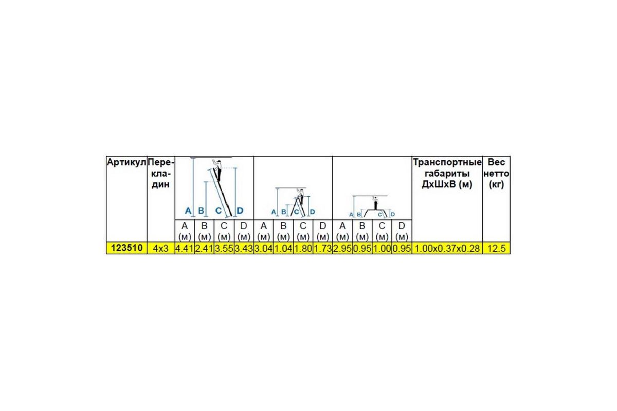 Высота секции – 0,95 м. В сложенном состоянии лестница поместится в багажник и не займёт много места в гараже.